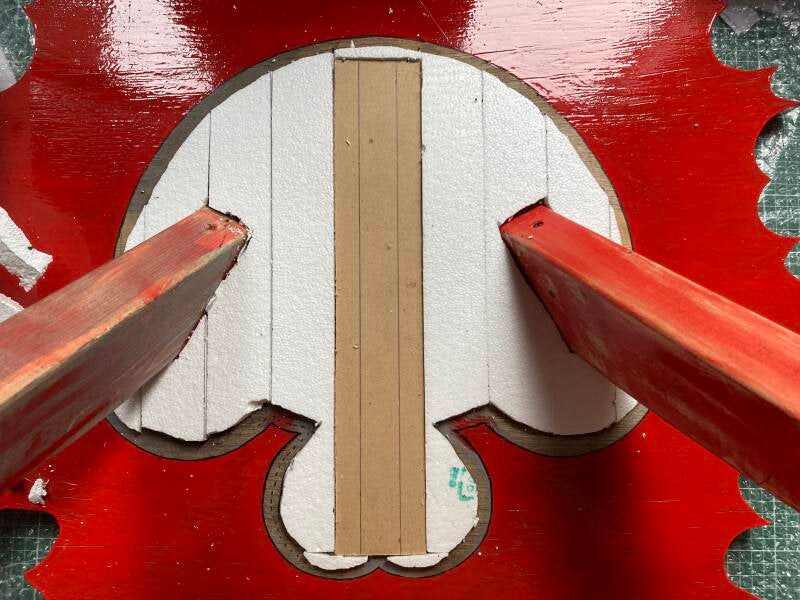 Om de gleuf open te houden heb ik het afgedekt met een plaatje hout, dat spoedig geheel uit het zicht zal verdwijnen zodra ik met de romp van het rendier aan de slag ga.