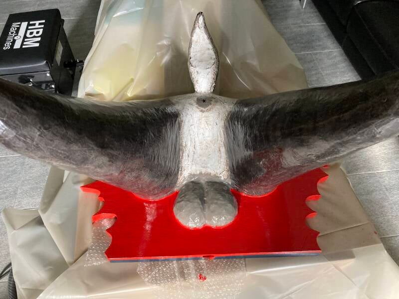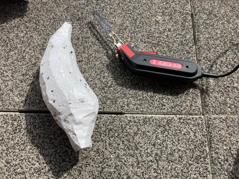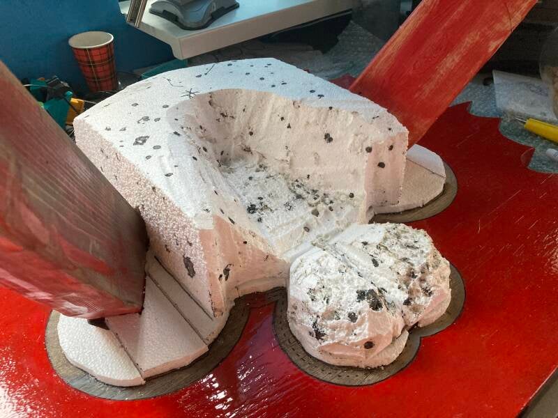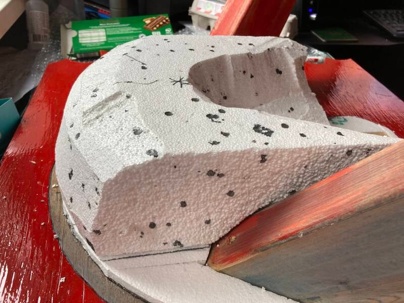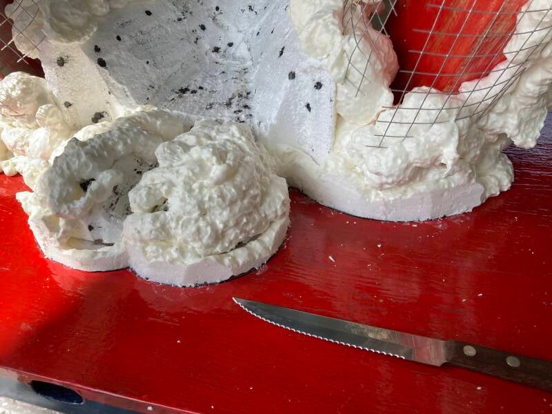 Na eerst te hebben overwogen om van gaas een staart te maken veranderde ik van gedachten en sneed het ruw uit in tempex. Ik duwde het in de zojuist aangebrachte purschuim en ondersteunde het tot het purschuim voldoende was uitgehard.