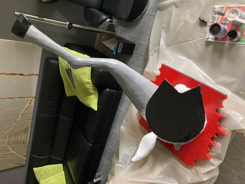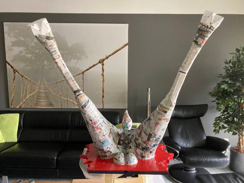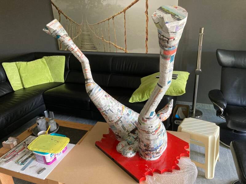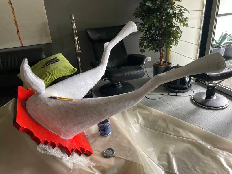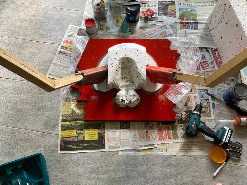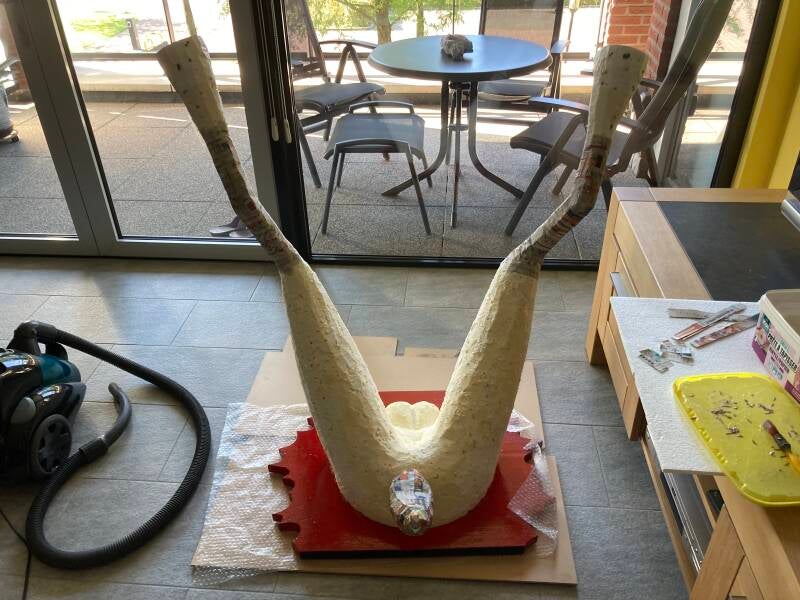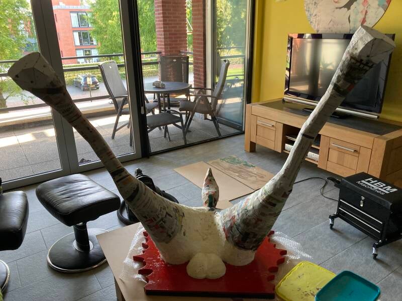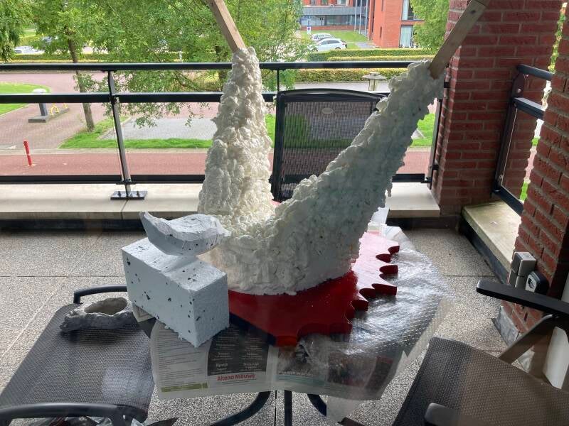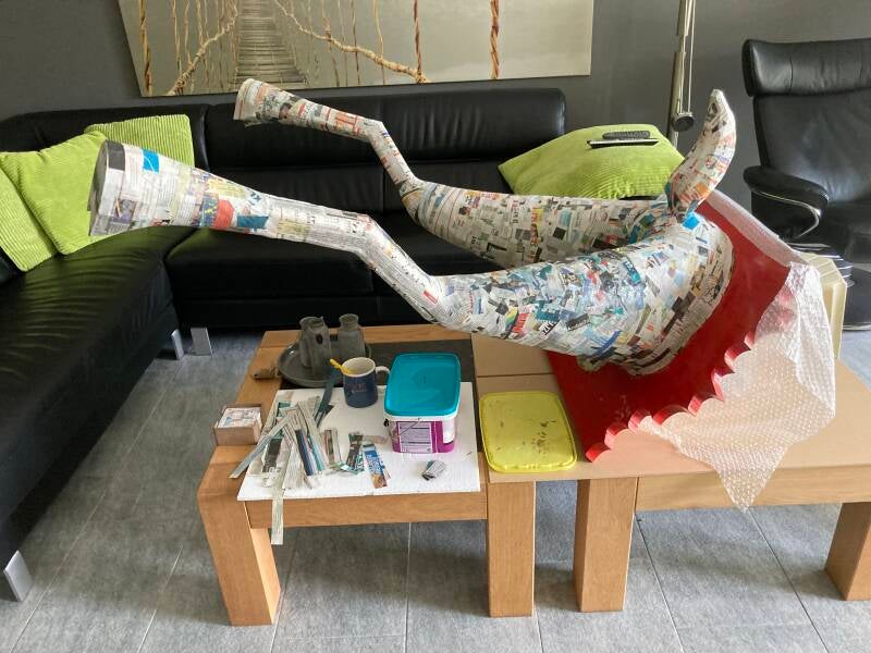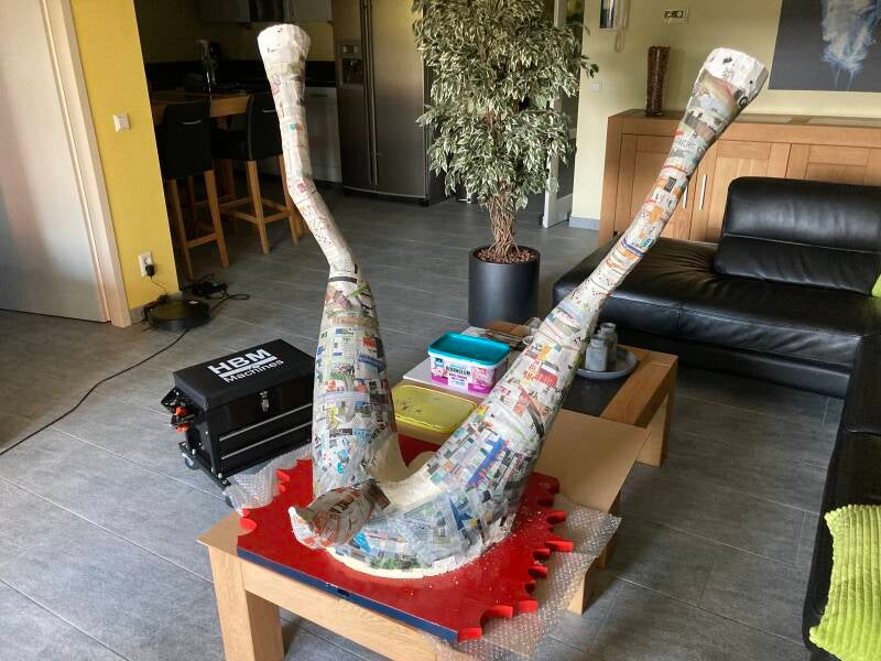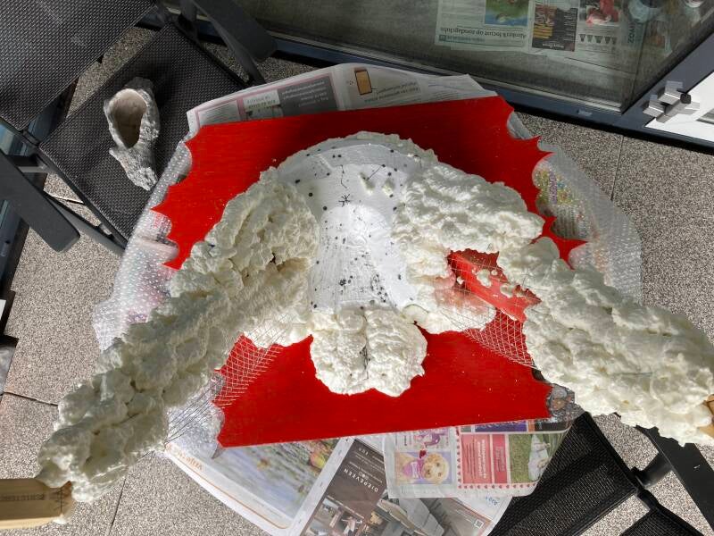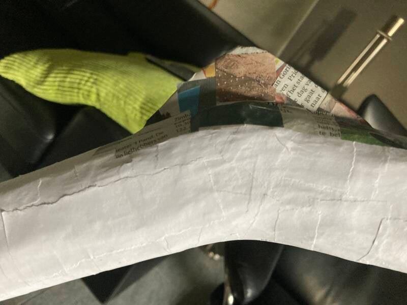 Tijd voor het aanbrengen van de eerste laag papier maché. Als dit is gebeurd dan kan de stofzuiger weer de kast in. Tot die tijd dwarrelen met elke beweging los geraakte stukjes purschuim en tempex naar beneden.