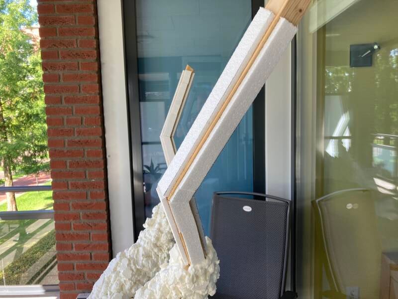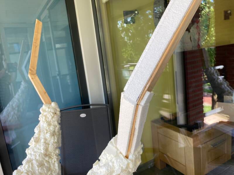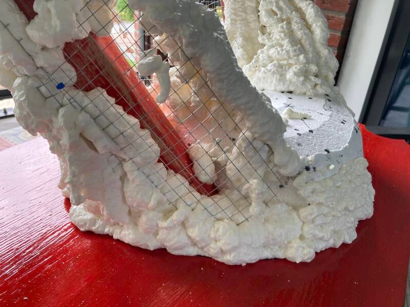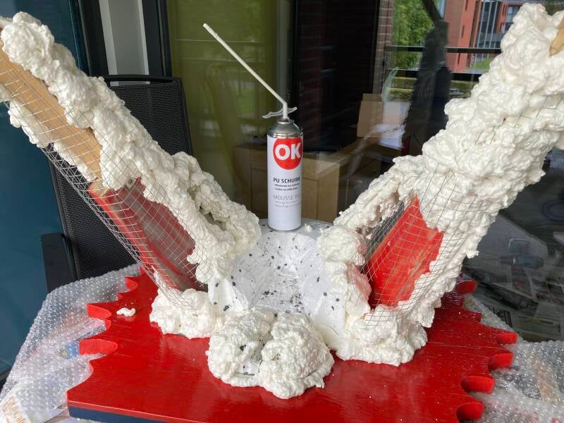 Om de achterpoten vorm te geven heb ik gebruik gemaakt van fijnmazig gaas en het vastgeniet aan het hout. Het hout, tempex en gaas verdween spoedig onder de snel uitdijende massa van purschuim. Na elke leeg gespoten bus wachtte ik tot het purschuim geheel was uitgewerkt om het vervolgens ruw in vorm te snijden. Op deze manier kwamen onverwachte gaten te voorschijn en kan ik gericht werken met het aanbrengen van de volgende laag.