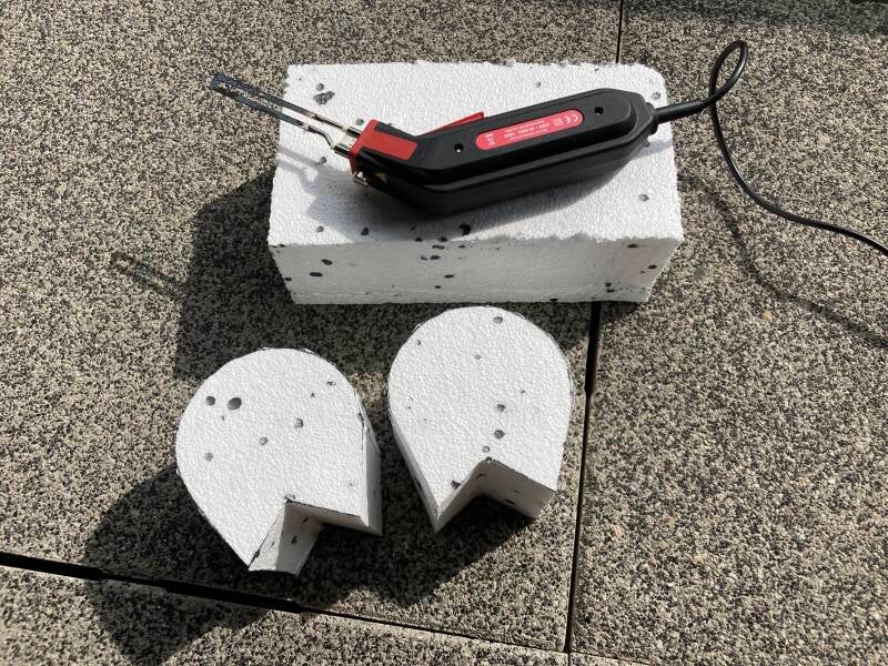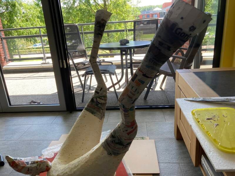 De poten zijn deels van tempex voorzien. De hoeken ervan vul ik later op met purschuim. De hoeven zijn ruw uit het tempex gesneden en voorzien van gaten.