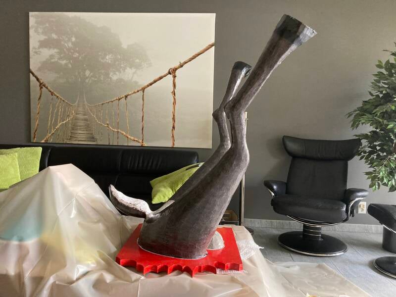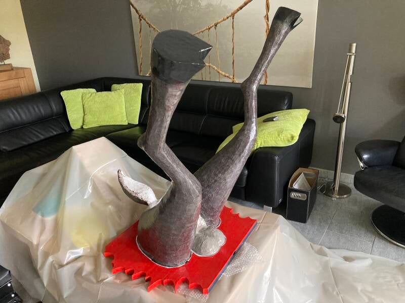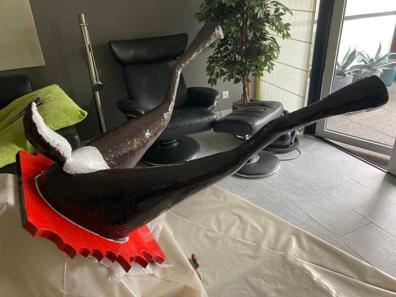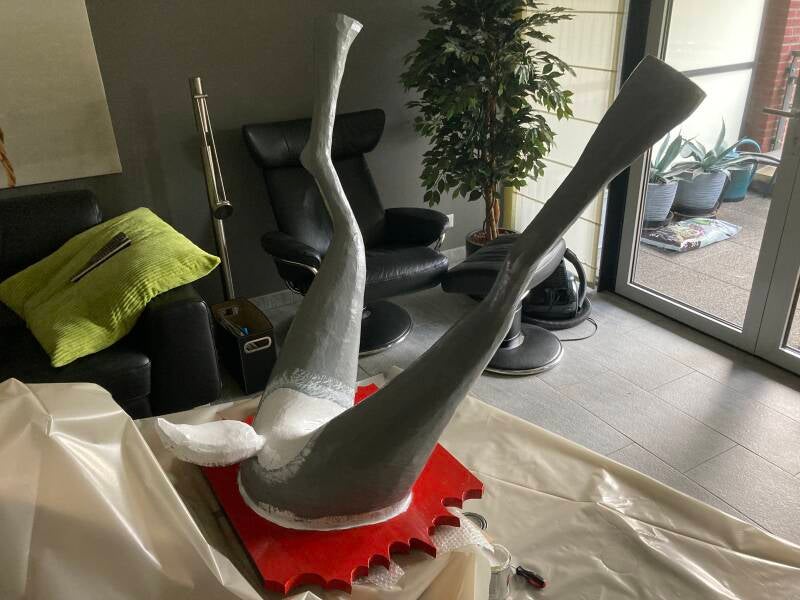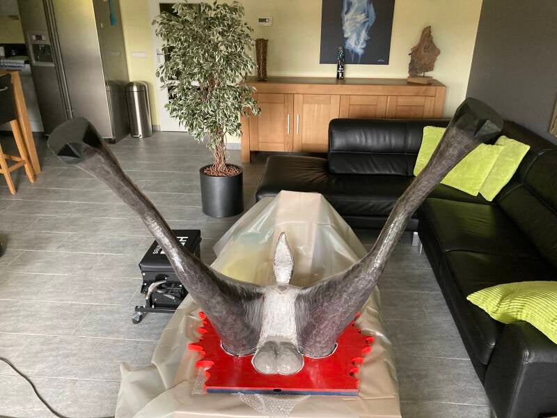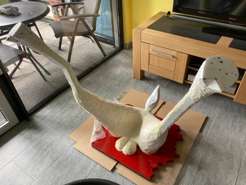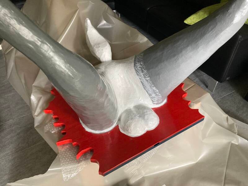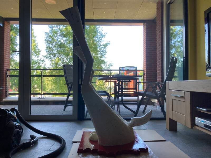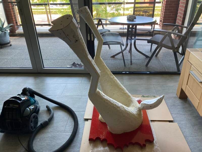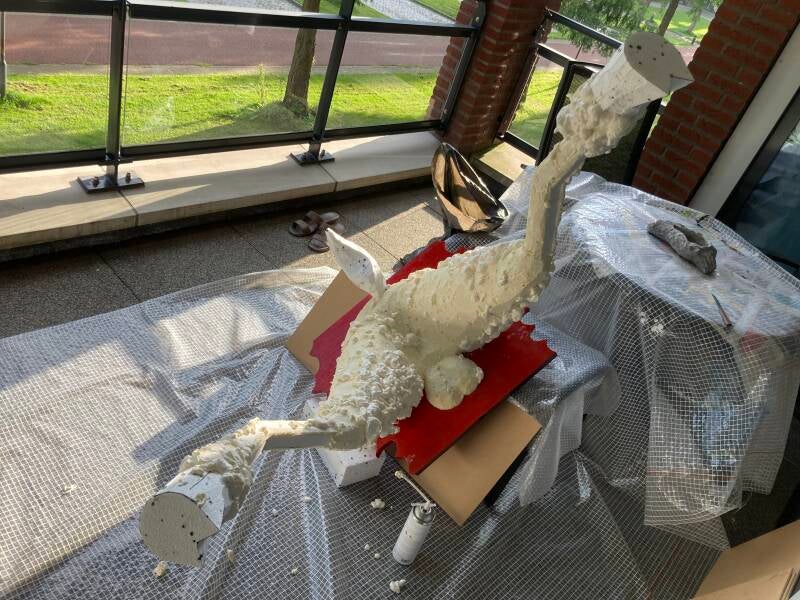 De hoeven bracht ik aan met behulp van de laatste bus purschuim waarmee ik alle ongelijkheden opvulde. In totaal heb ik vier bussen purschuim van elk 500 ml gebruikt om het lichaam vorm te geven. Ik heb een vuilniszak vol uitgehard purschuim afgesneden.
