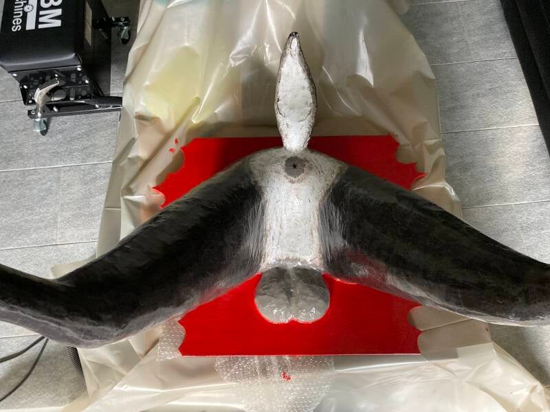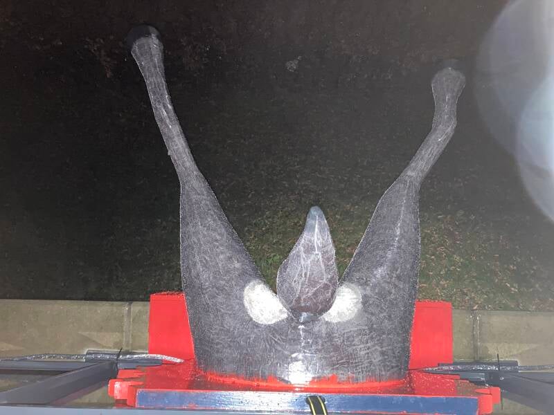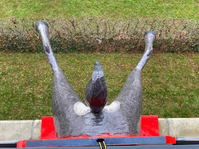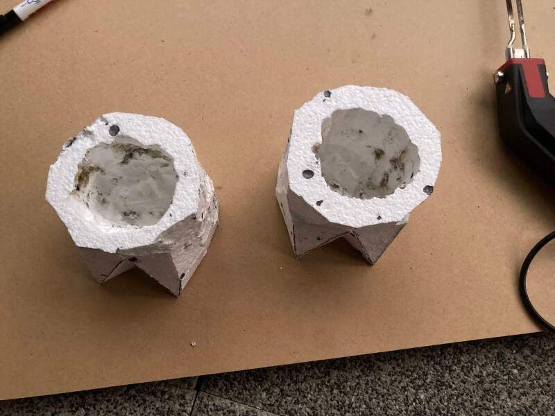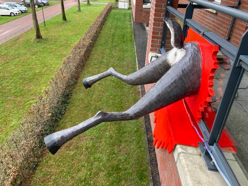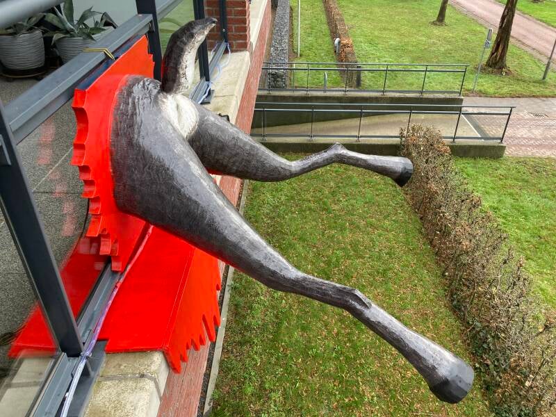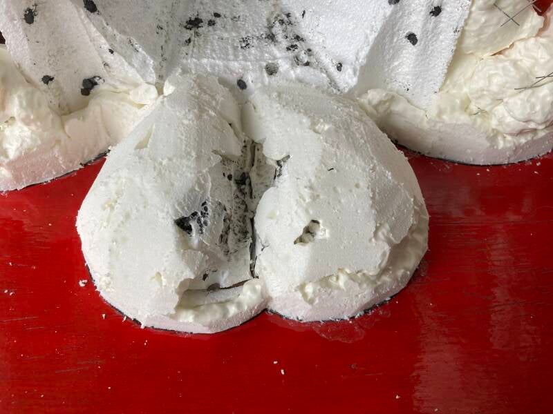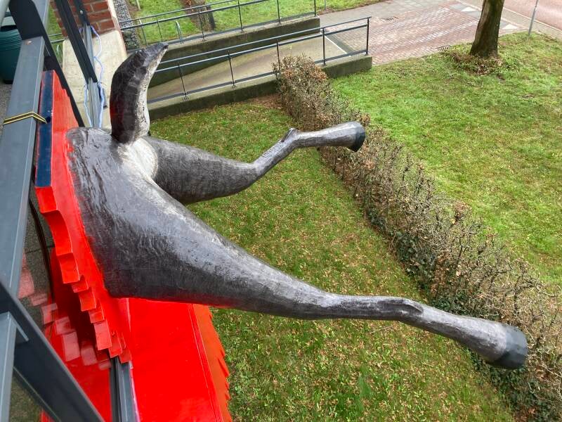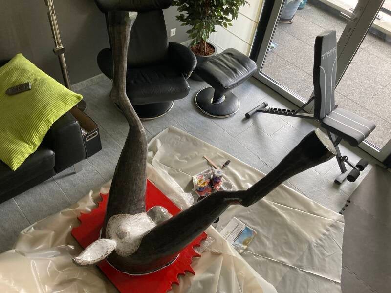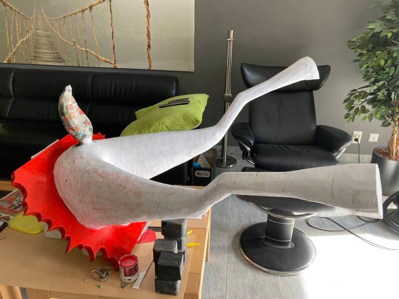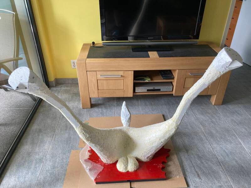 De hoeven bracht ik aan met behulp van de laatste bus purschuim waarmee ik alle ongelijkheden opvulde. In totaal heb ik vier bussen purschuim van elk 500 ml gebruikt om het lichaam vorm te geven. Ik heb een vuilniszak vol uitgehard purschuim afgesneden.