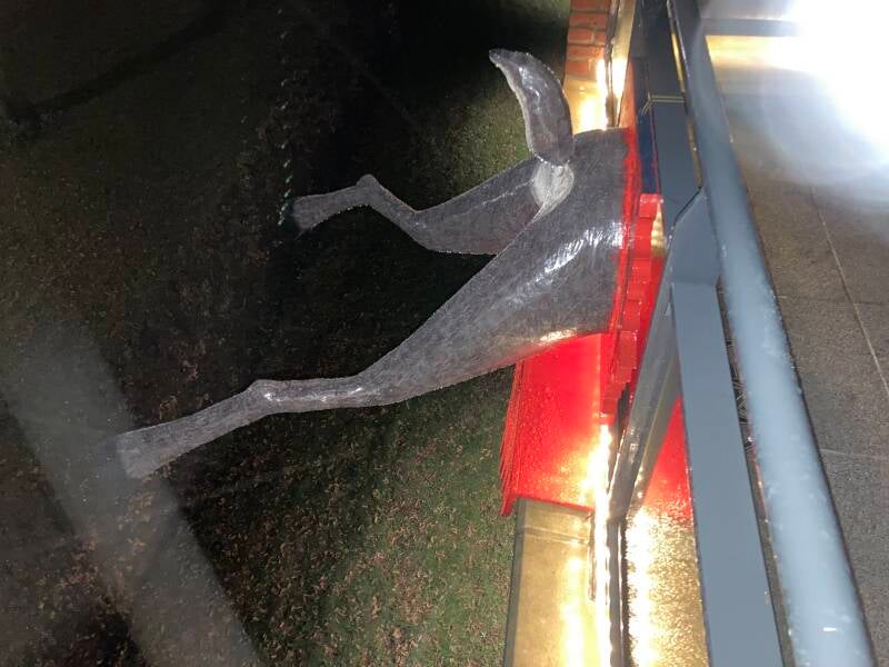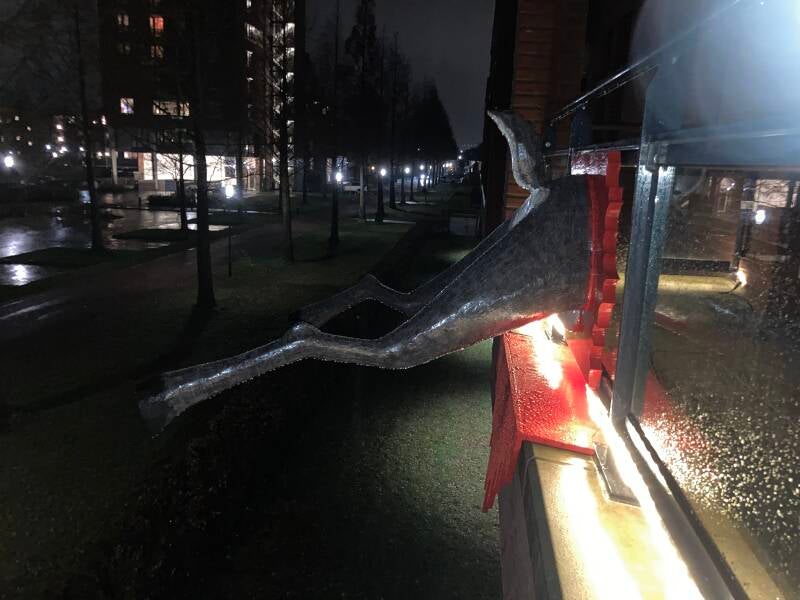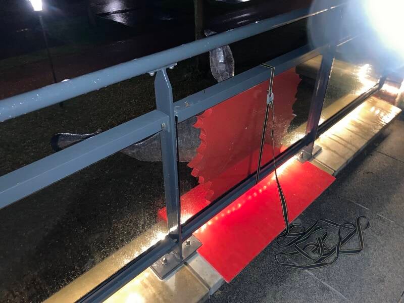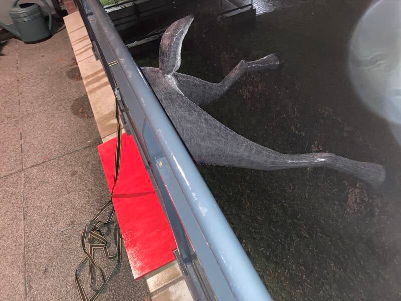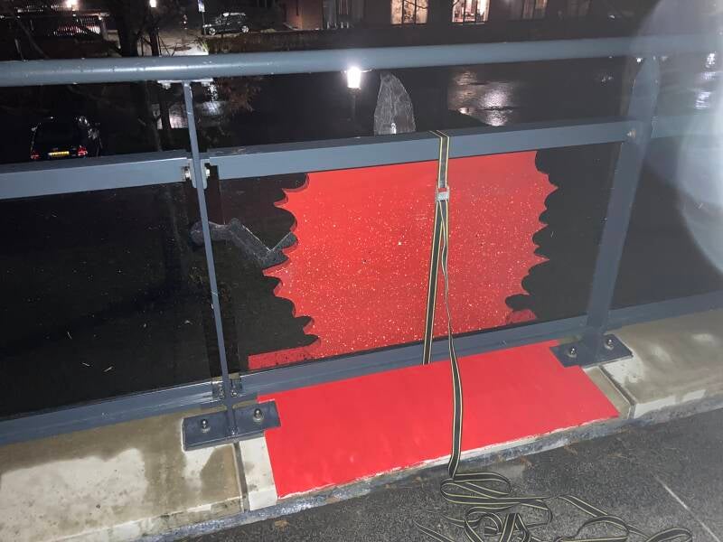 Behalve een rood gekleurde houten plaat tegen het glas komen er ook twee rood geschilderde platen er onder, alsof er bloed van het glas en het balkon stroomt. Voor de mensen die langskomen zal alleen de golvende plaat zichtbaar zijn.