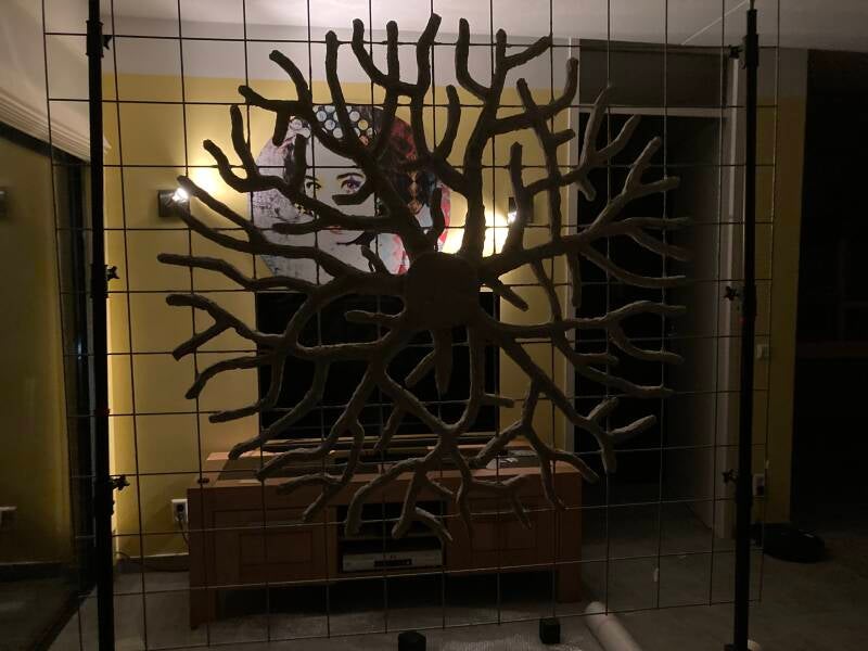 Ik heb een fijnmazig gaas gebruikt voor het vormgeven van de takken en kabelbinders om het gaas aan het paneel te bevestigen. Deze heb ik aan één kant van het paneel bevestigd.