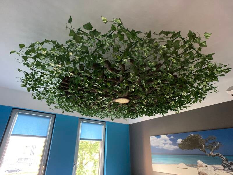 De kunstplanten verspreidde een doordringende geur nadat ik deze uit de verpakking had gehaald, maar na een paar dagen was deze geheel verdwenen. Er zijn achtenveertig strengen kunstmatige, maar levensecht lijkende klimopplanten van elk twee meter lang in verwerkt. Deze boom zal zijn bladeren niet laten gaan vallen en het jaarrond groene bladeren hebben. Vast gemaakt aan het draadpaneel met groen gekleurde tairips, waarvan de uiteinden zijn afgeknipt.