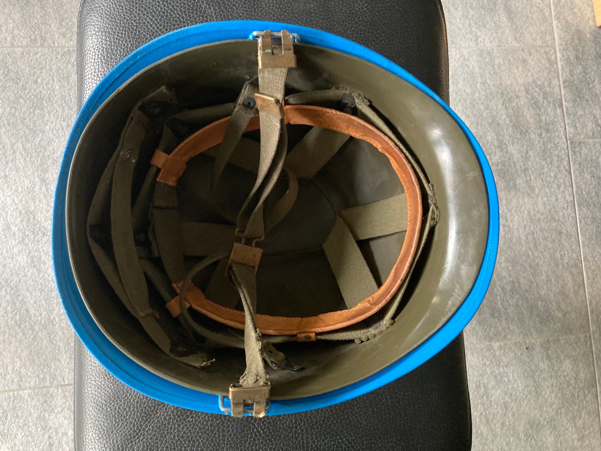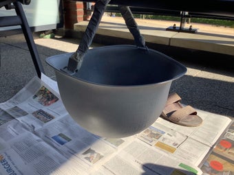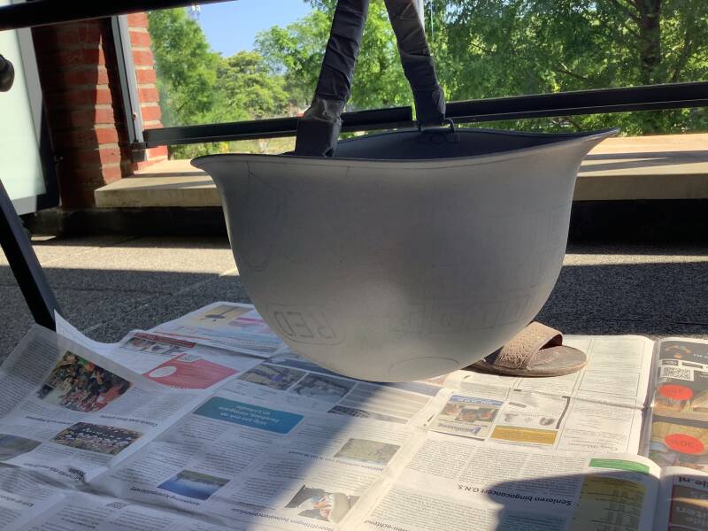 Een stalen legerhelm belandde op mijn pad. De start voor een nieuw project. De kunststofhelm aan de binnenzijde heb ik eerst verwijderd voor er een begin met de werkzaamheden werd gemaakt. De groene kleur kreeg de eerste krassen te verwerken van het schuurpapier waarmee ik het oppervlak ruwer maakte. De eerste laag bestond uit een primer en het groen verdween onder een lichtgrijze laag.