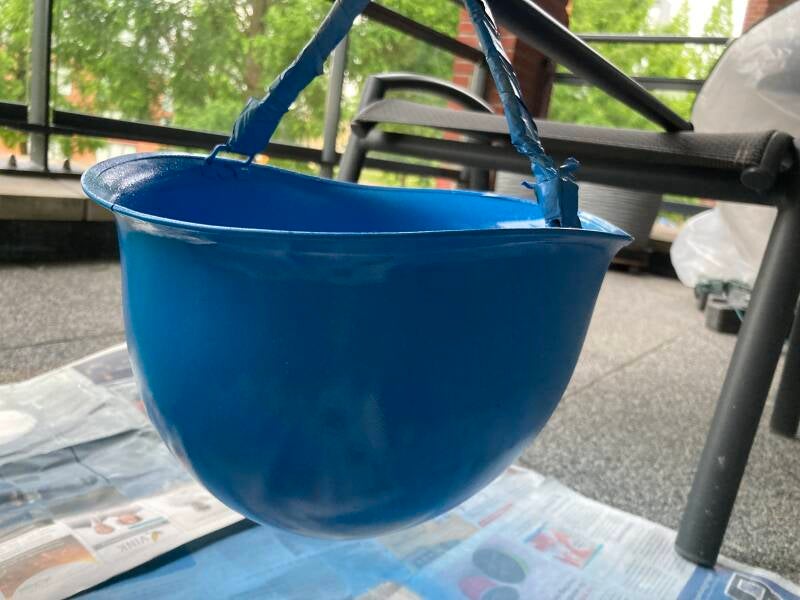 Aan de voorkant van de helm komt er iets over het blauw heen. Het bleek uitdagender te zijn dan verwacht. Op papier heb ik de vorm uitgeknipt en op de helm gehouden, terwijl ik met plakband de vorm vastlegde.
