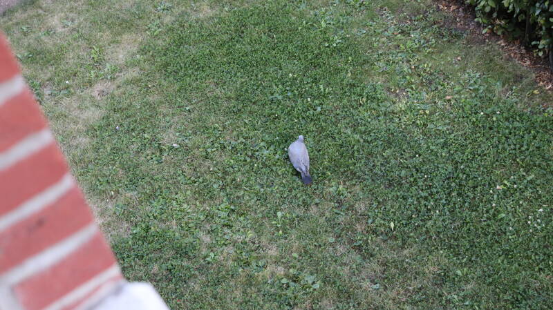 Het aantal mezen dat zich laat zien is aan het toenemen. Er is volgens mij ook een hiërarchie. Als de koolmees arriveert verjaagt die in de meeste gevallen de aanwezige pimpelmees. Tot zover heb ik slechts een enkele keer een pimpelmees en koolmees tegelijk hier zien eten. De eksters hebben het wat moeilijker gekregen door wat ik heb opgehangen, maar deze vogels bewijzen wel slim te zijn. Fladderend met de vleugels om hun balans te bewaren op de halve kokosnoot hakken ze in op de in vet verpakte zaden en vruchten. Vervolgens vliegen ze naar de grond om op hun gemak te verorberen wat naar beneden is gevallen. Het is me nog niet gelukt om dit vast te leggen op de foto, maar ik zag wel een willekeurige duif op het grasveld onder het balkon. Deze heb ik ook maar meteen op de foto gezet.