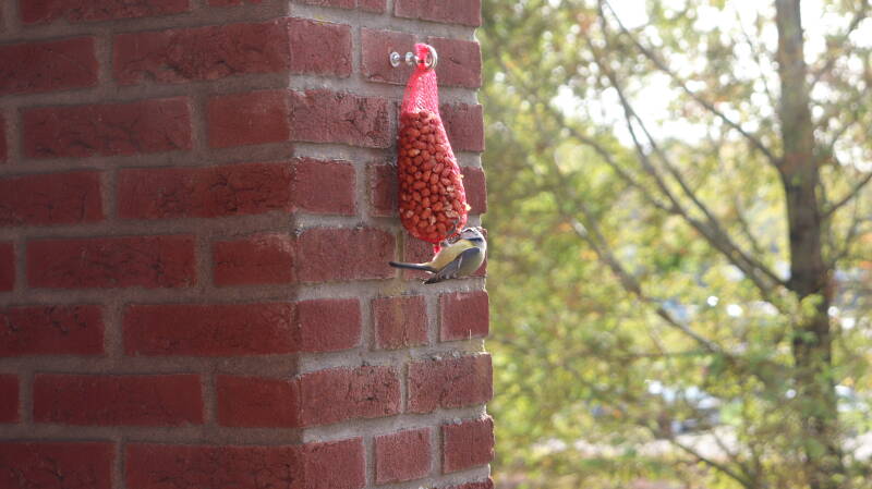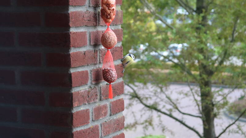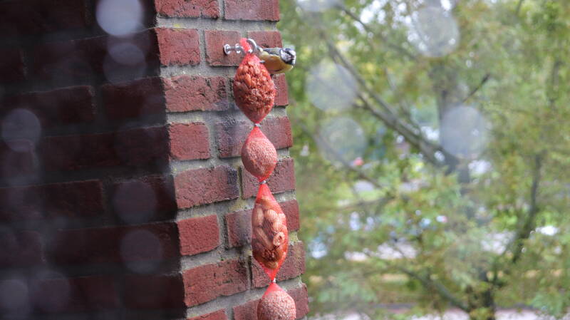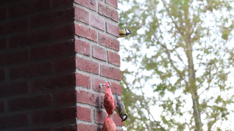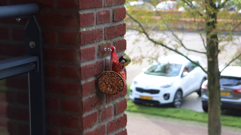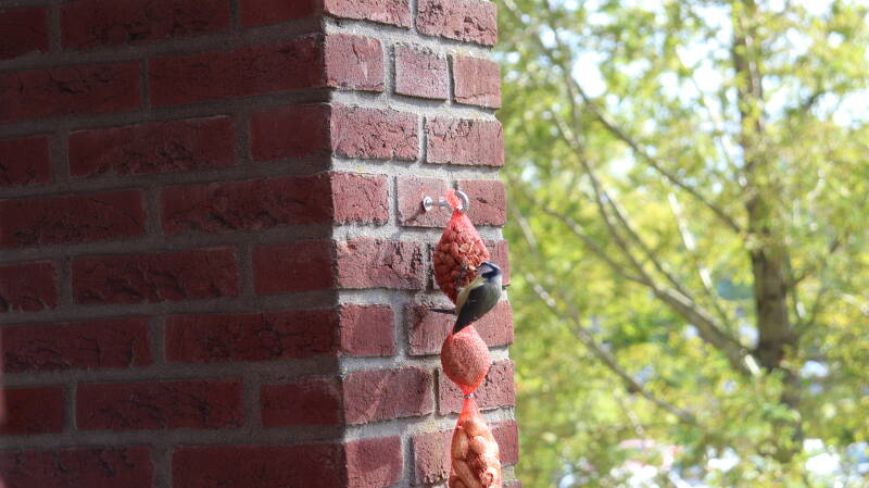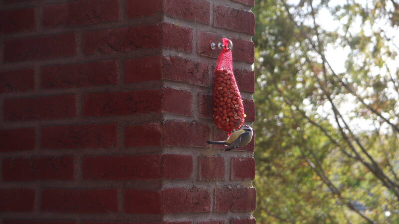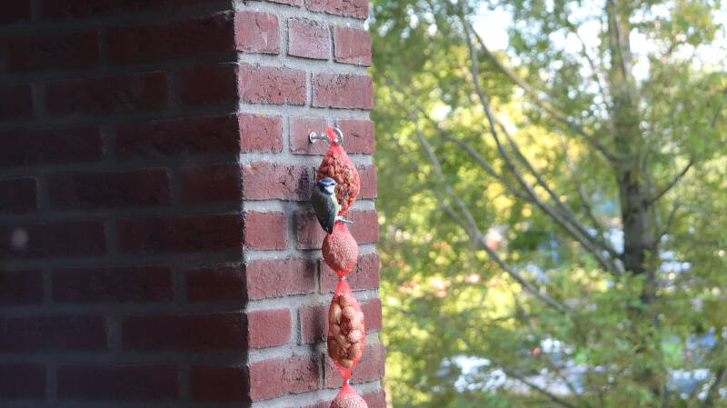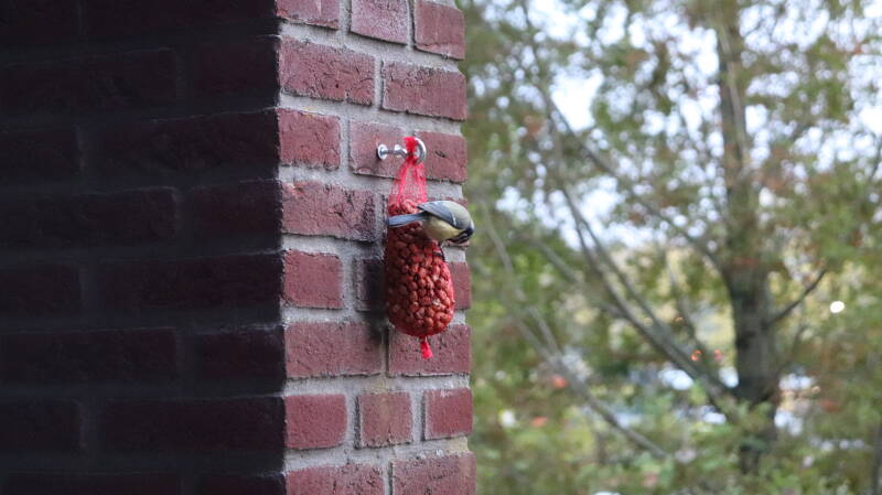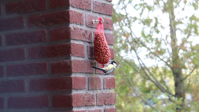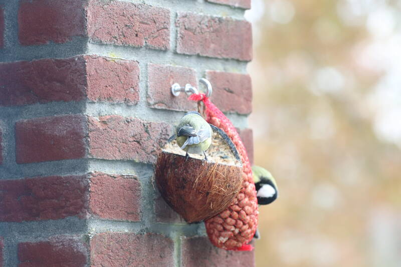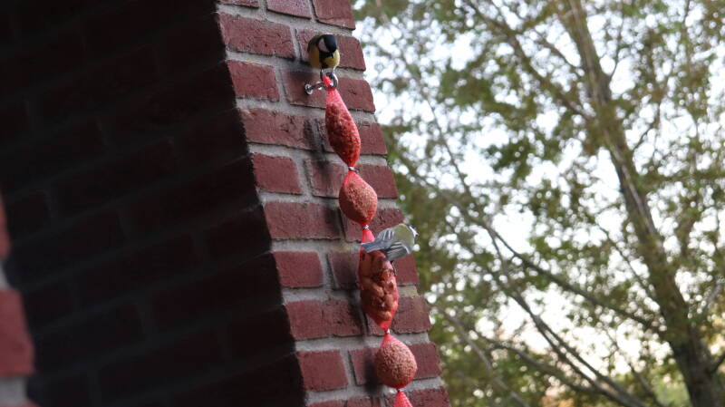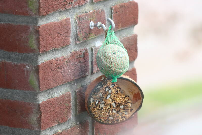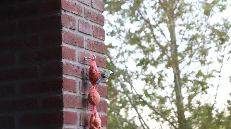 Aan de buitenkant van het balkon zijn twee, metalen haken bevestigd. Geschikt om noten en zaden in een netje, vetbollen, kokosnoten, etc. aan op te hangen. Ik heb er vanaf het balkon geen zicht op, dus het lijkt misschien een wat vreemde locatie, maar ik kan er vanuit mijn thuiswerk- en hobbyruimte vanachter het bureau naar kijken voor wat plezierige afleiding.