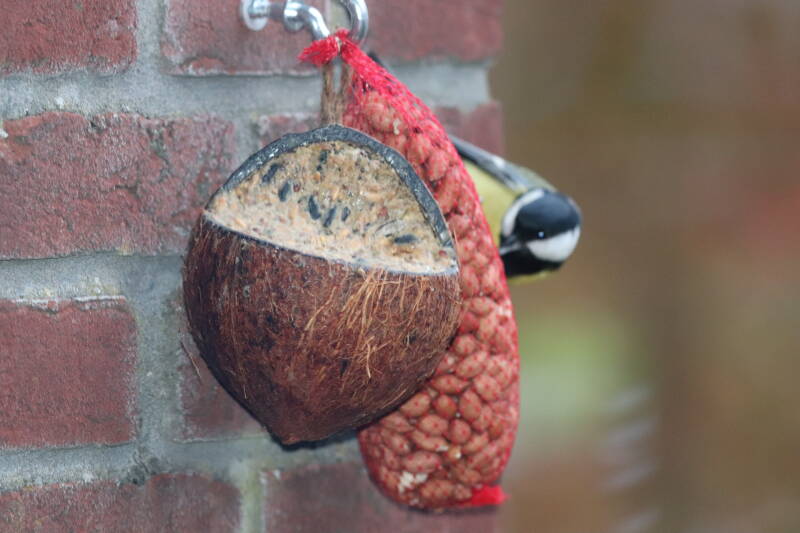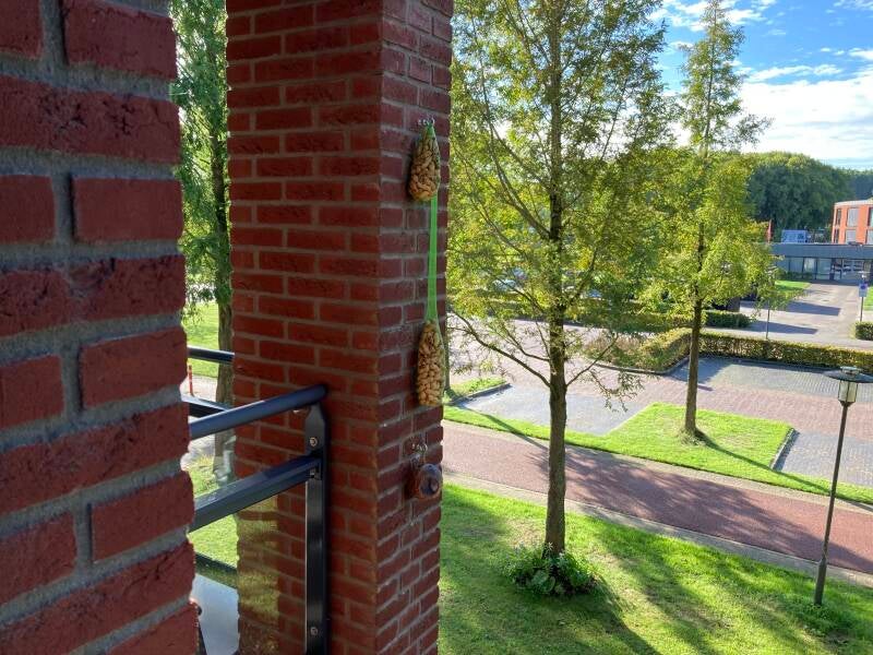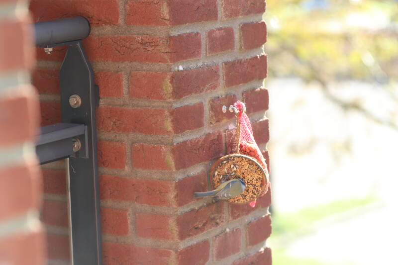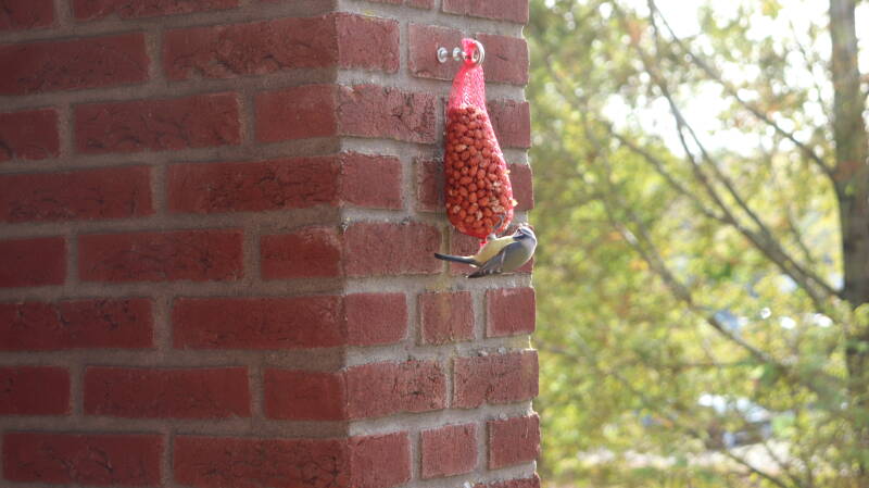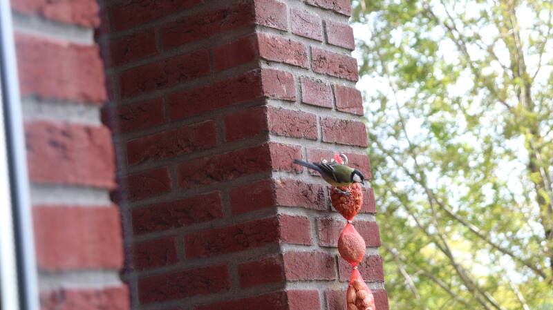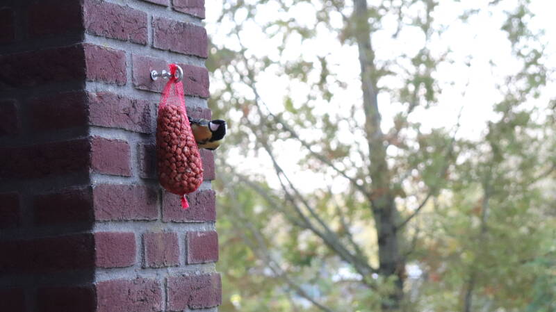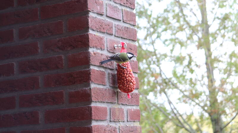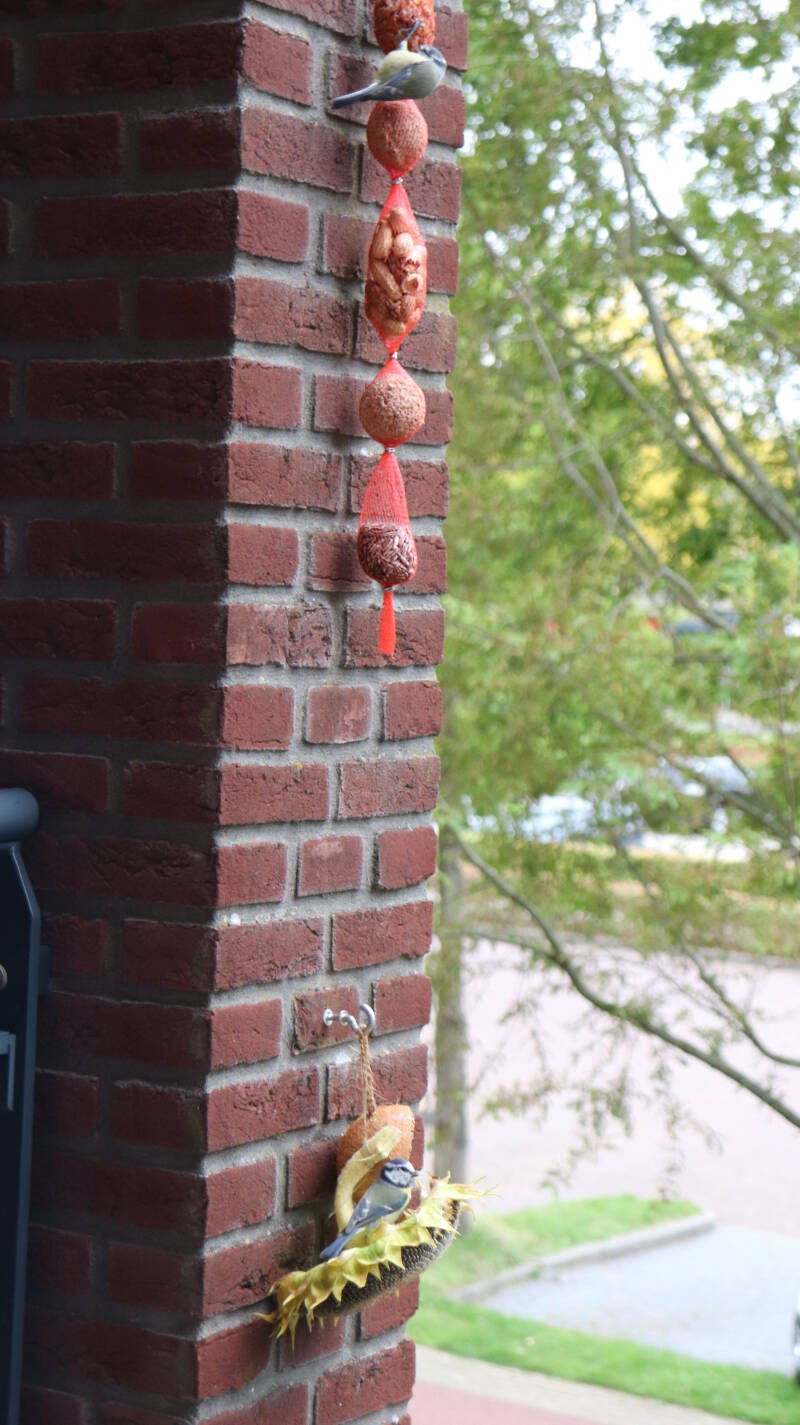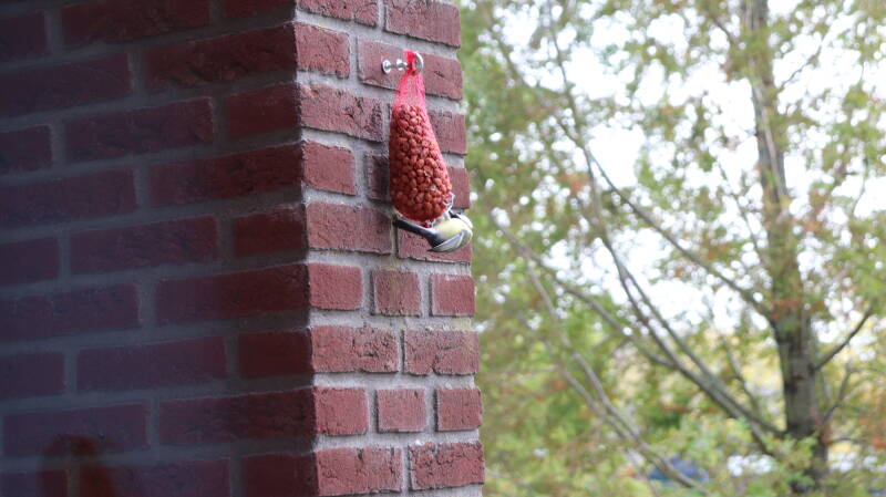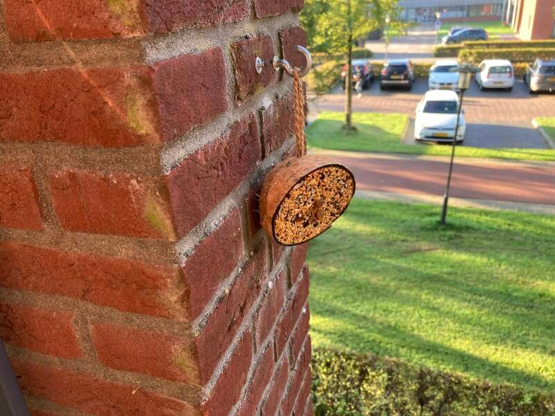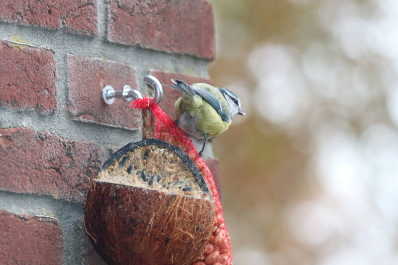 Aan de buitenkant van het balkon zijn twee, metalen haken bevestigd. Geschikt om noten en zaden in een netje, vetbollen, kokosnoten, etc. aan op te hangen. Ik heb er vanaf het balkon geen zicht op, dus het lijkt misschien een wat vreemde locatie, maar ik kan er vanuit mijn thuiswerk- en hobbyruimte vanachter het bureau naar kijken voor wat plezierige afleiding.