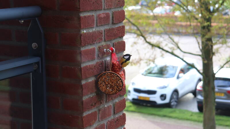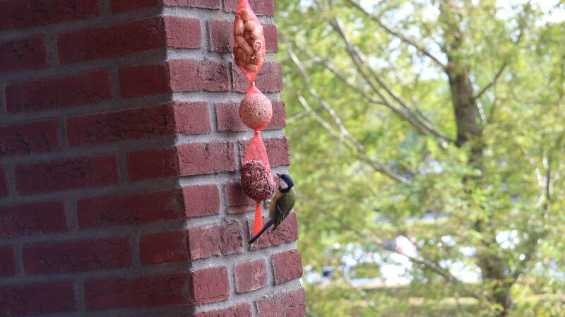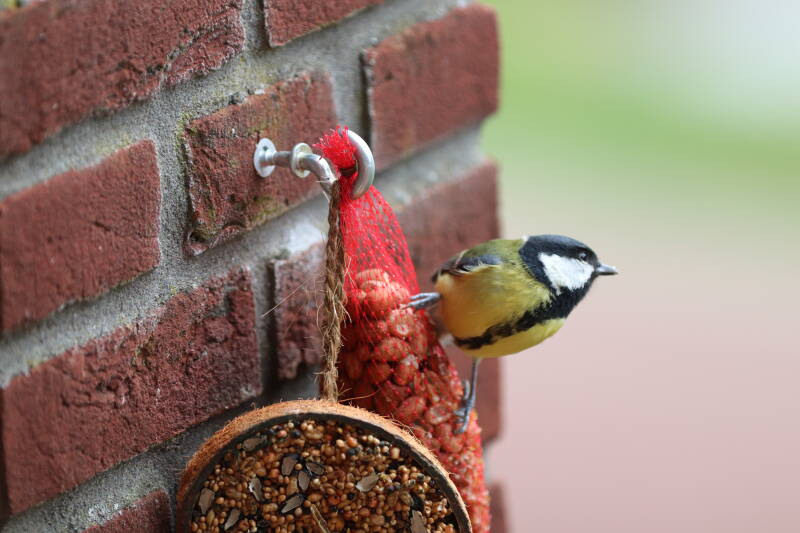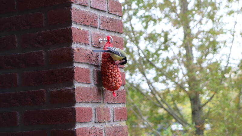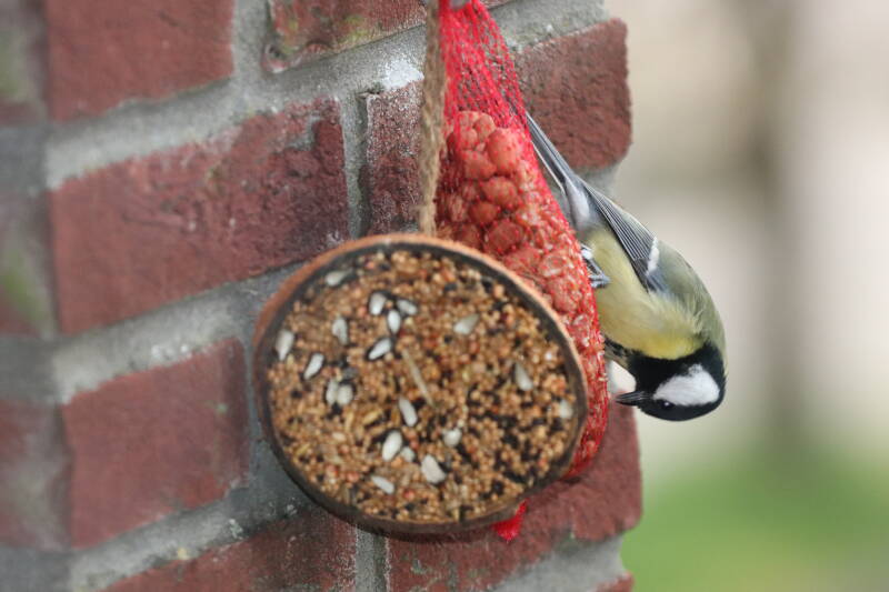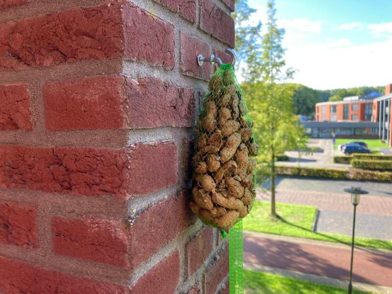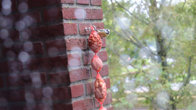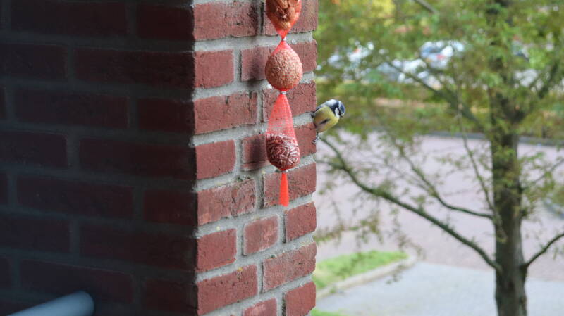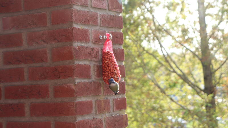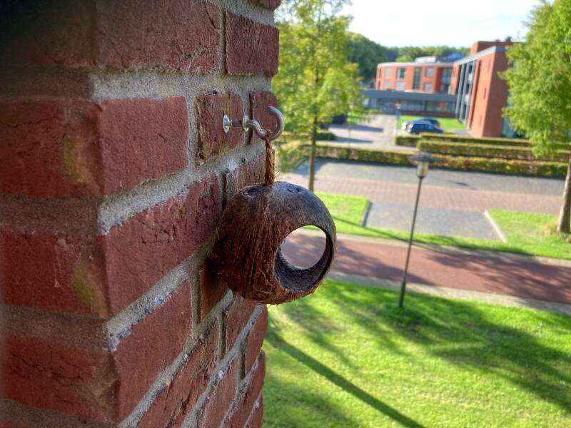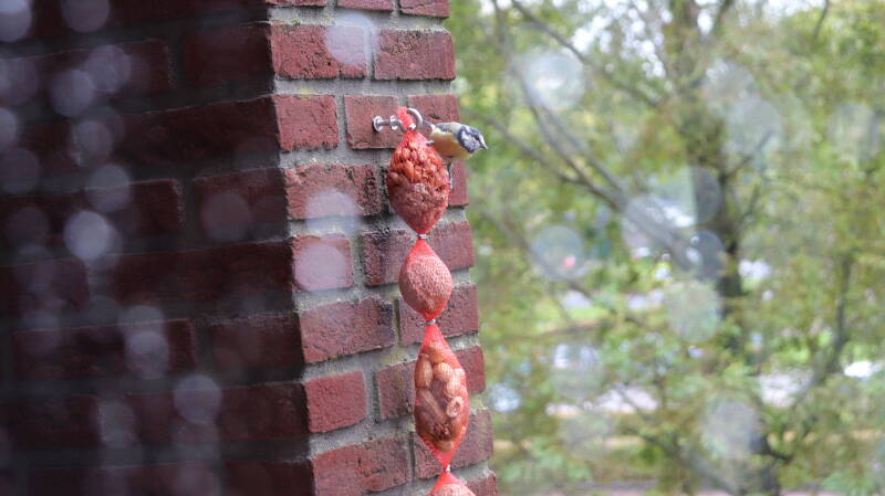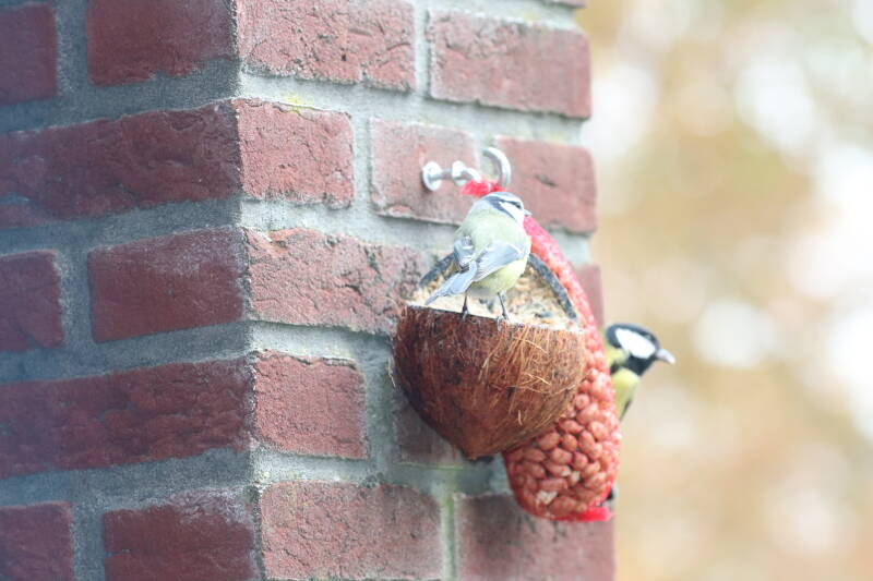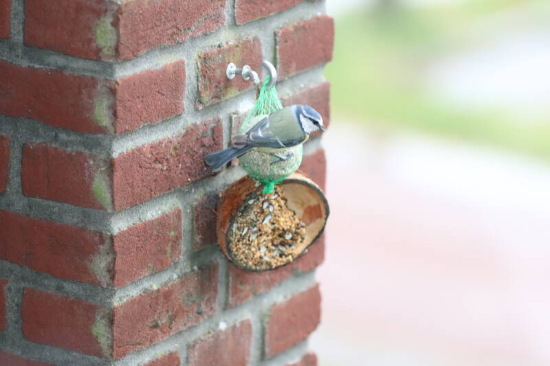 Aan de buitenkant van het balkon zijn twee, metalen haken bevestigd. Geschikt om noten en zaden in een netje, vetbollen, kokosnoten, etc. aan op te hangen. Ik heb er vanaf het balkon geen zicht op, dus het lijkt misschien een wat vreemde locatie, maar ik kan er vanuit mijn thuiswerk- en hobbyruimte vanachter het bureau naar kijken voor wat plezierige afleiding.