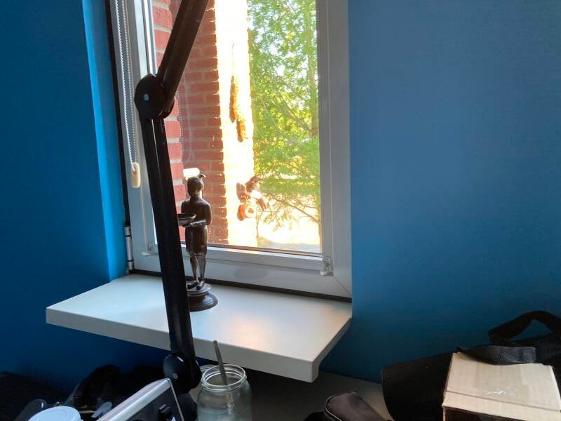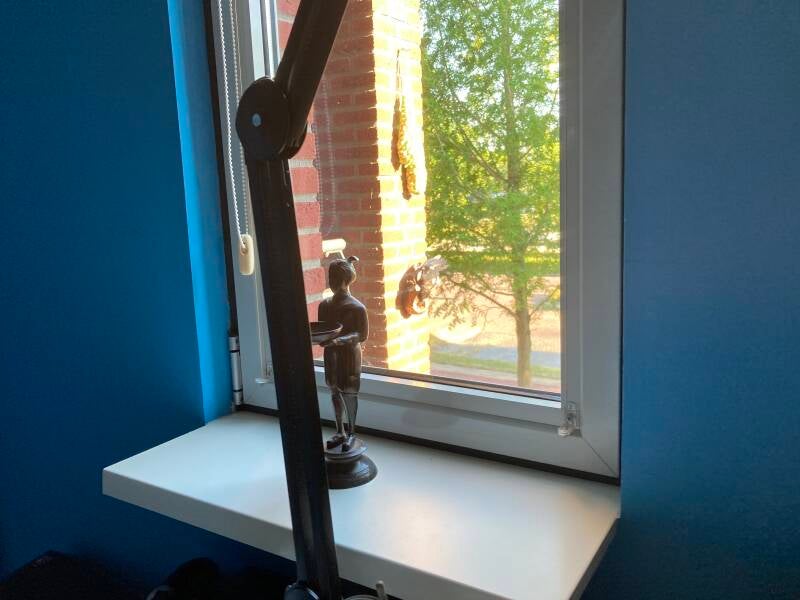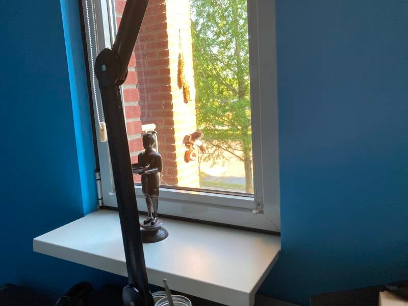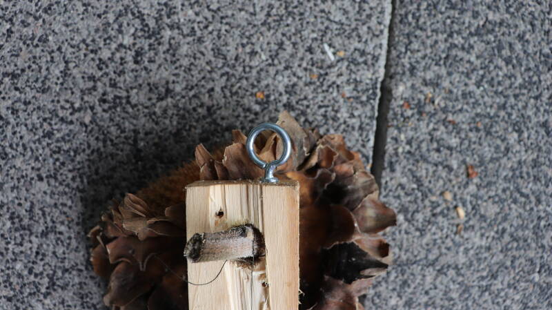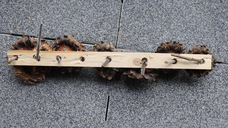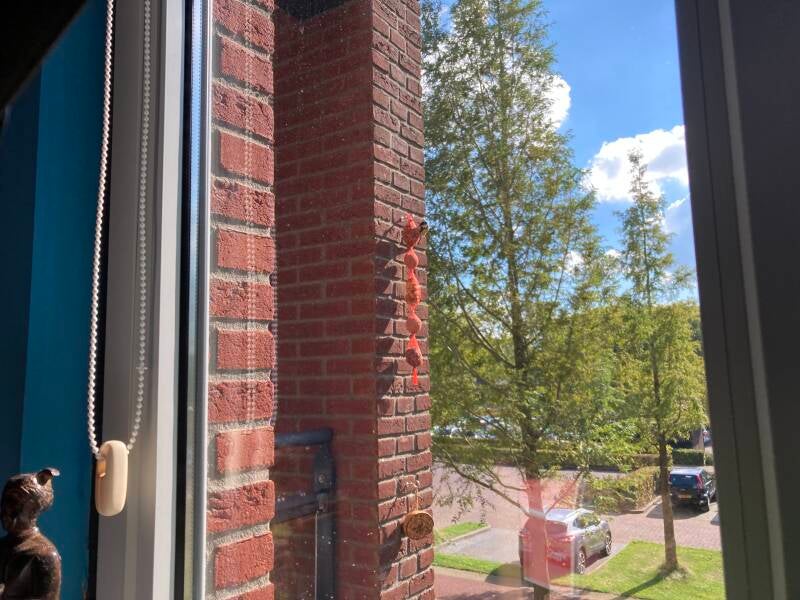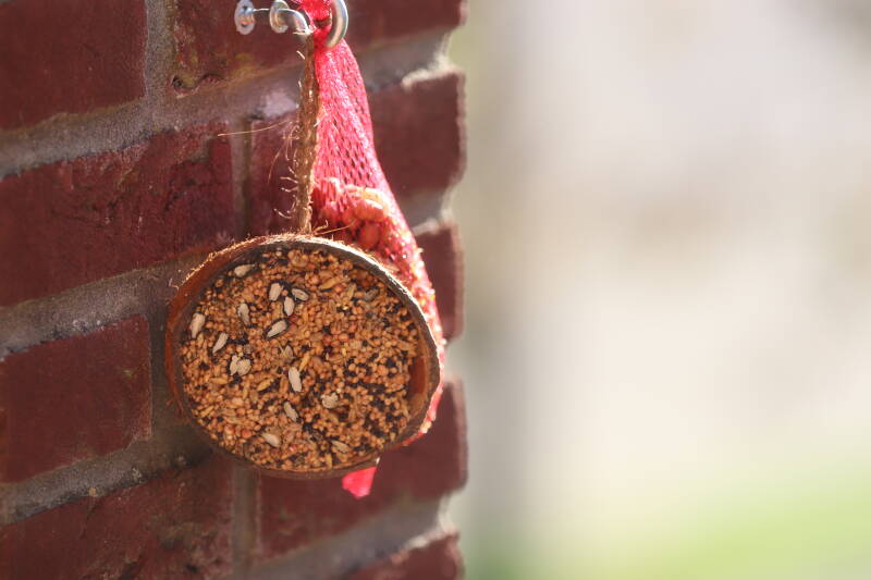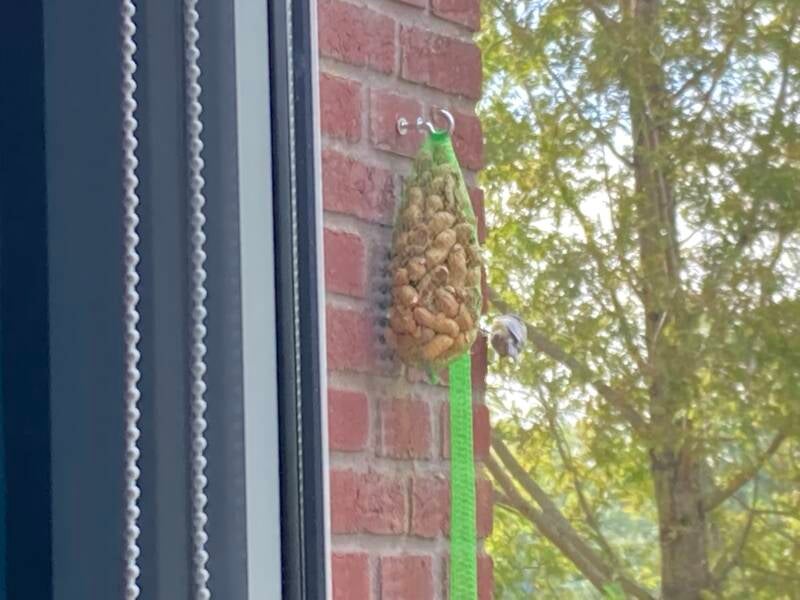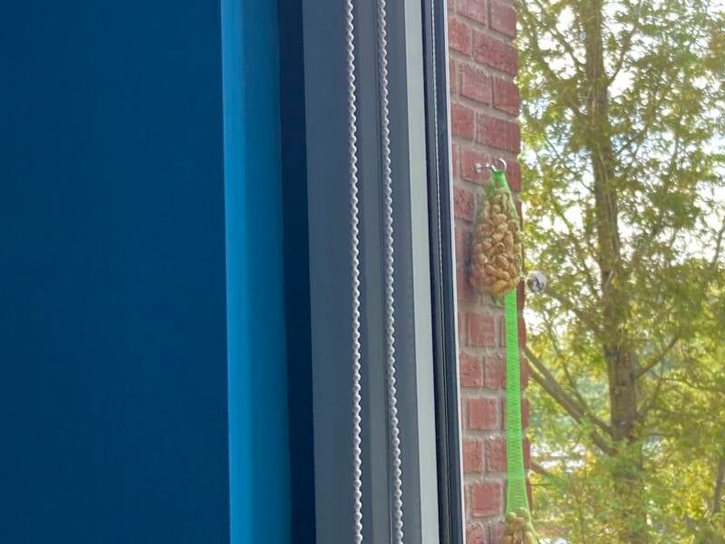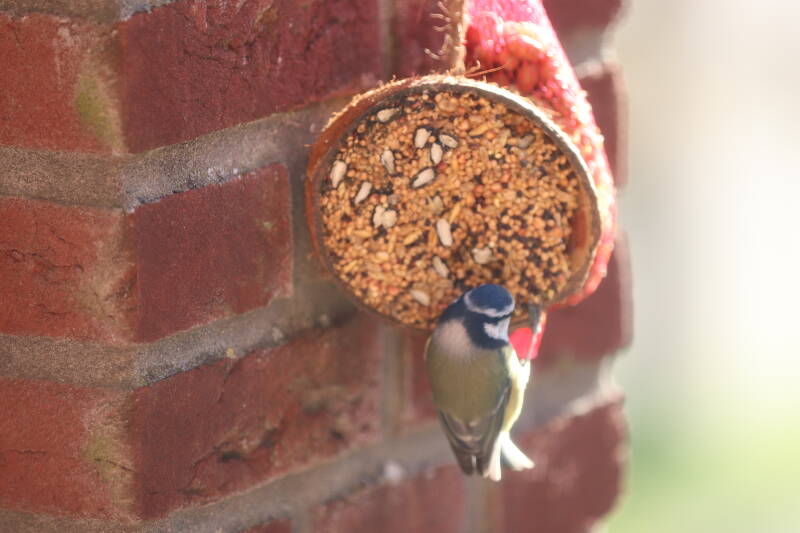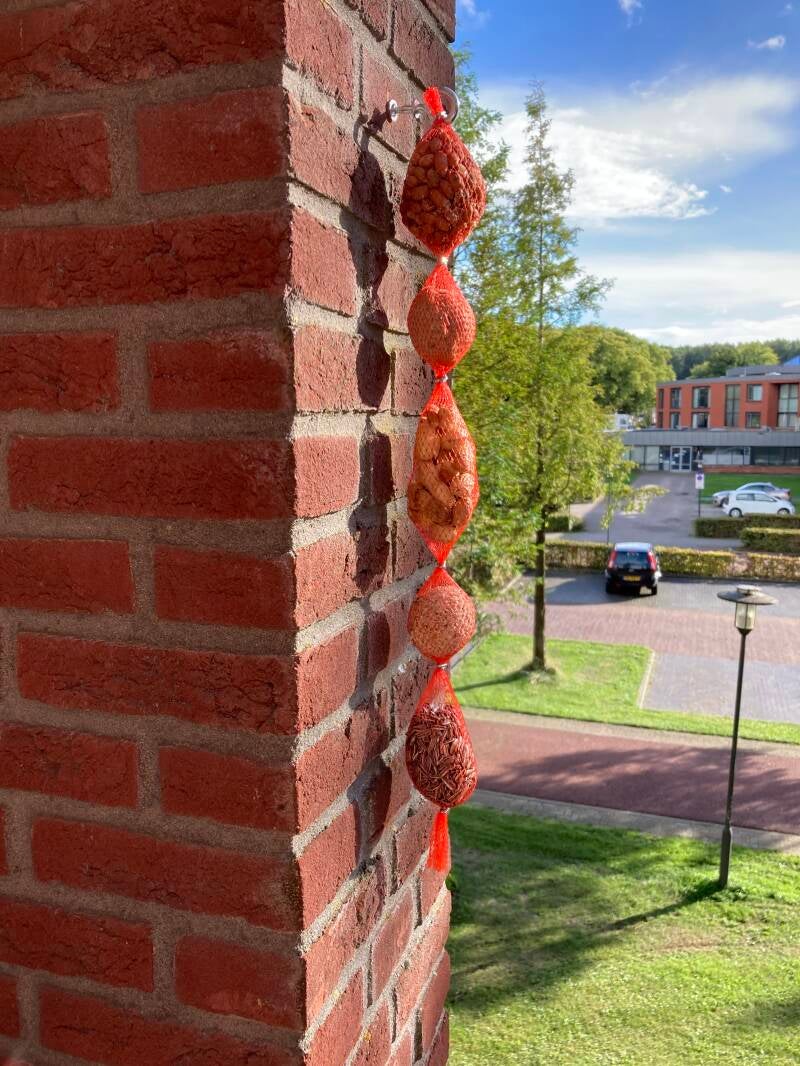 Aan de buitenkant van het balkon zijn twee, metalen haken bevestigd. Geschikt om noten en zaden in een netje, vetbollen, kokosnoten, etc. aan op te hangen. Ik heb er vanaf het balkon geen zicht op, dus het lijkt misschien een wat vreemde locatie, maar ik kan er vanuit mijn thuiswerk- en hobbyruimte vanachter het bureau naar kijken voor wat plezierige afleiding.
