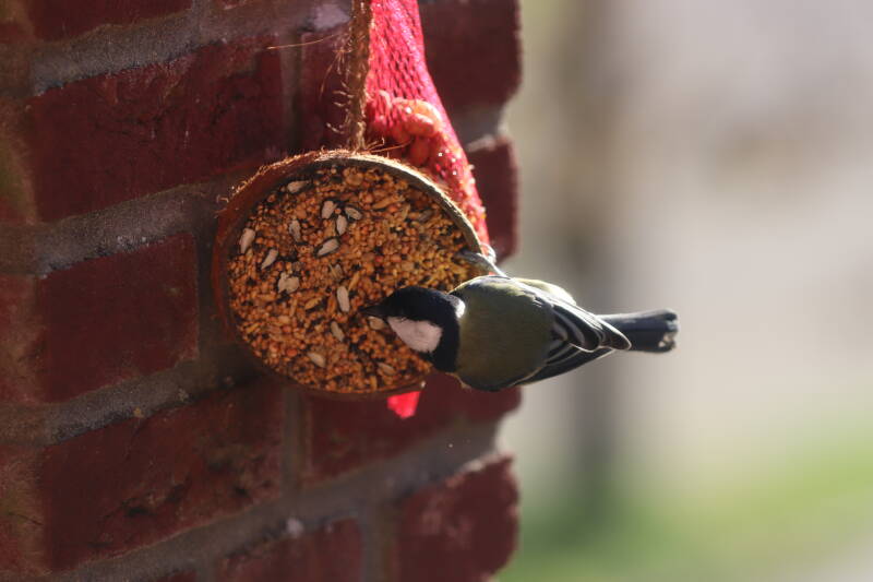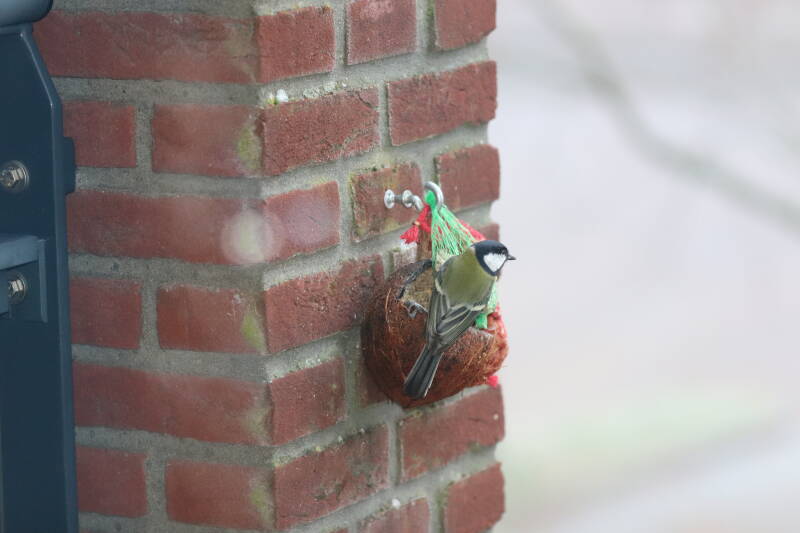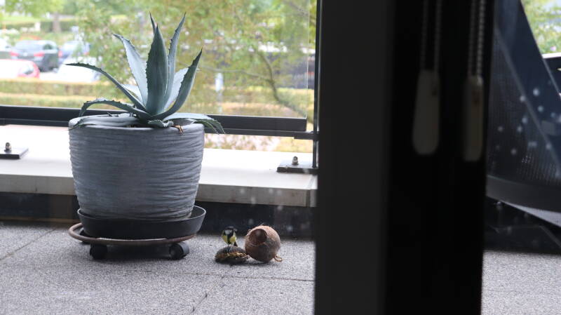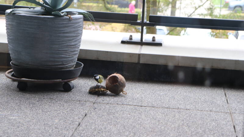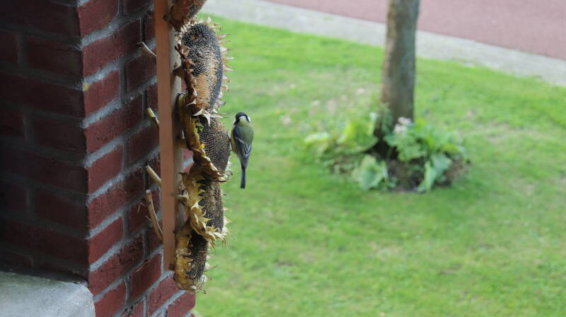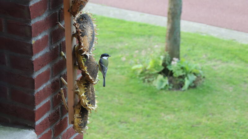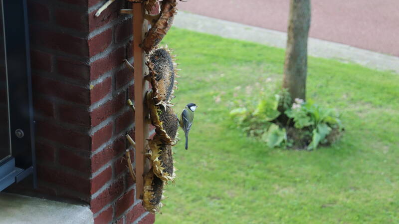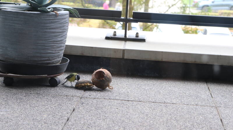 Op het balkon had ik een vrijwel kaal gegeten kokosnoot liggen om te drogen en een overgebleven zonnebloem die niet in de constructie paste die ik voor de overige zonnebloemen had gemaakt. Een koolmees liet deze gelegenheid niet aan zich voorbij gaan. Na even rondom de plant in de pot te hebben gehopt deed het zich met minder moeite dan voorheen het geval was te goed aan de zaden van de zonnebloem.