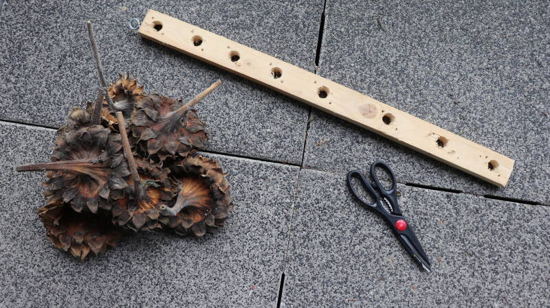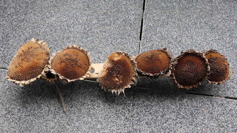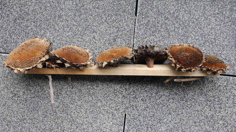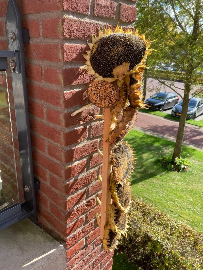 De mezen hebben eind oktober de opgehangen zonnebloemen inmiddels vrijwel kaal gepikt. Ik vind het tijd geworden om het op te ruimen.