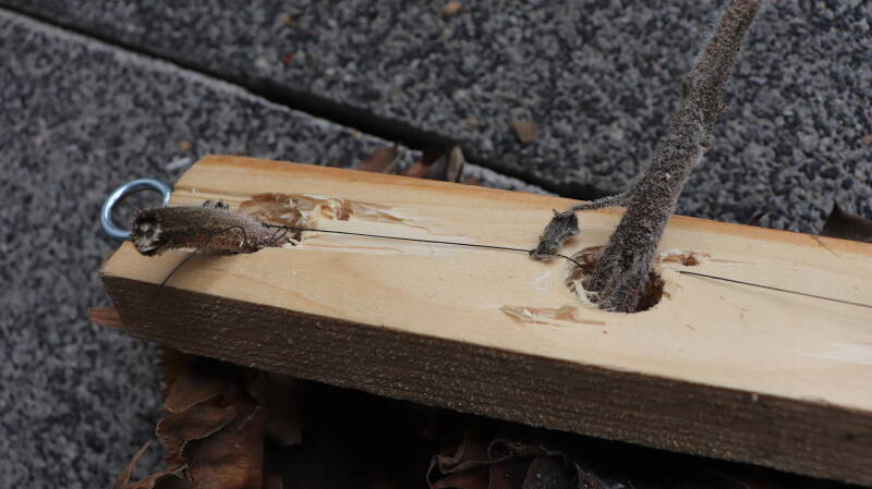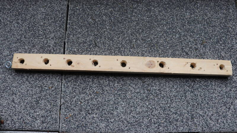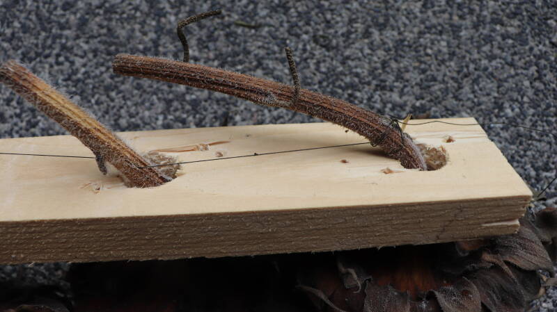 Als ik volgend jaar weer aan zonnebloemen kan komen dan ga ik ze opnieuw op deze manier ophangen. Een eenvoudige lat (68 cm*4,8 cm*2 cm) waarin acht gaten met een diameter van twintig millimeter zijn geboord en in de bovenkant een haak gedraaid om het geheel op te kunnen hangen. Om te voorkomen dat de zonnebloemen na het ophangen van de lat eruit vallen heb ik met een naald een draad door de stelen getrokken en vastgeknoopt.