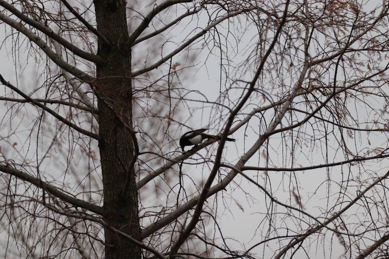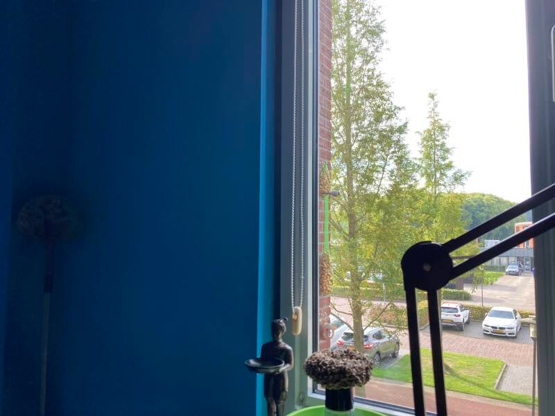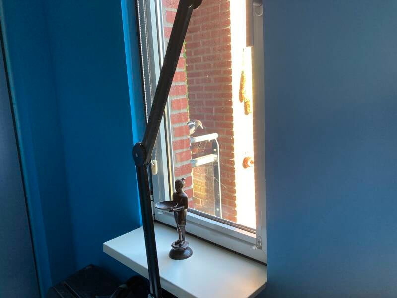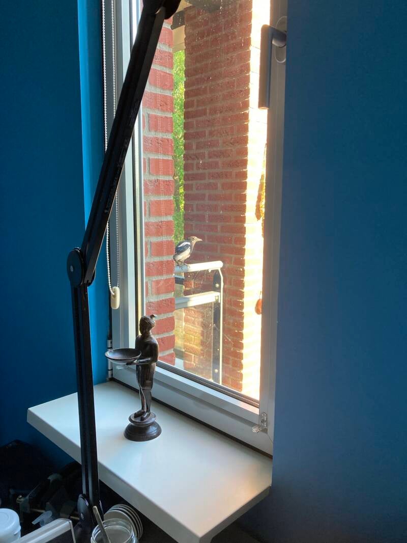De vogels lijken zelden rechtstreeks hier naar toe te vliegen. De eksters en mezen zie ik veelal in de dichtstbijzijnde bomen voor ze het laatste deel van de tocht naar de voederlocatie af gaan leggen. En zelfs dan land de ekster nog vaak op één van de waterslagen of de reling van het balkon en werpt een nieuwsgierige blik door het raam naar binnen voor het een meter verder vliegt om zijn maag te kunnen vullen. Deze argwaan zal wel gebaseerd zijn op eerdere ervaringen.
