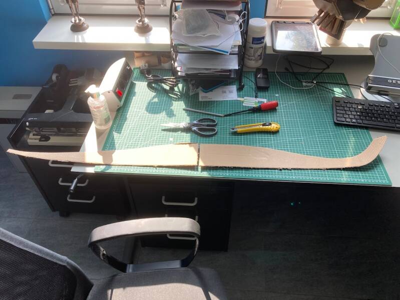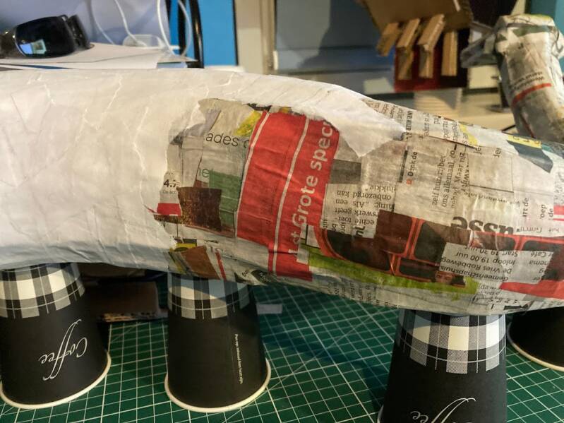 Ontevreden over de kop heb ik deze nog breder gemaakt door er karton op de papier-maché te lijmen.