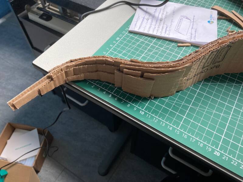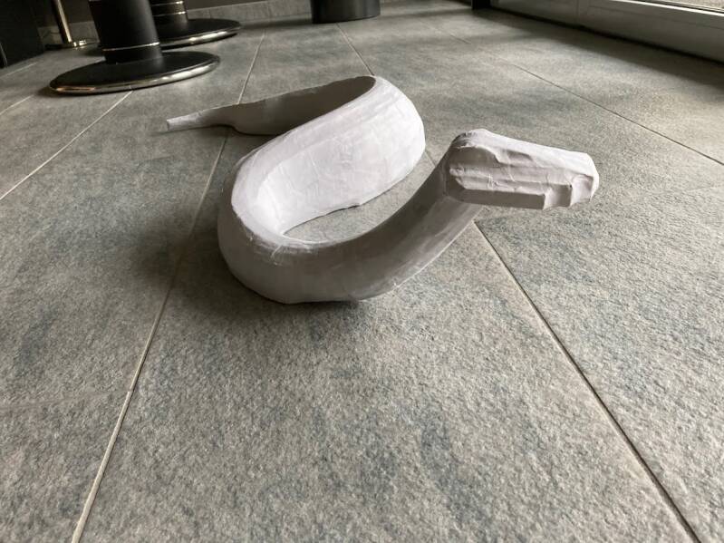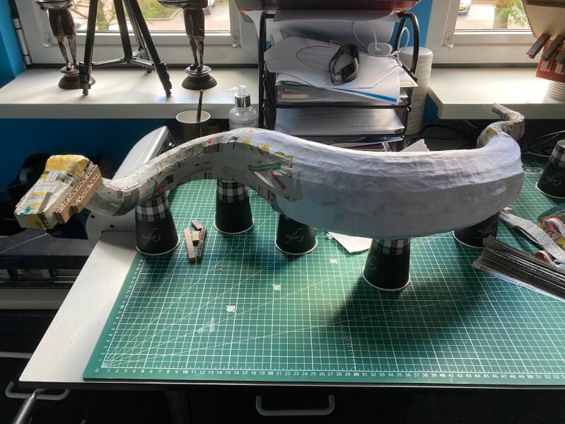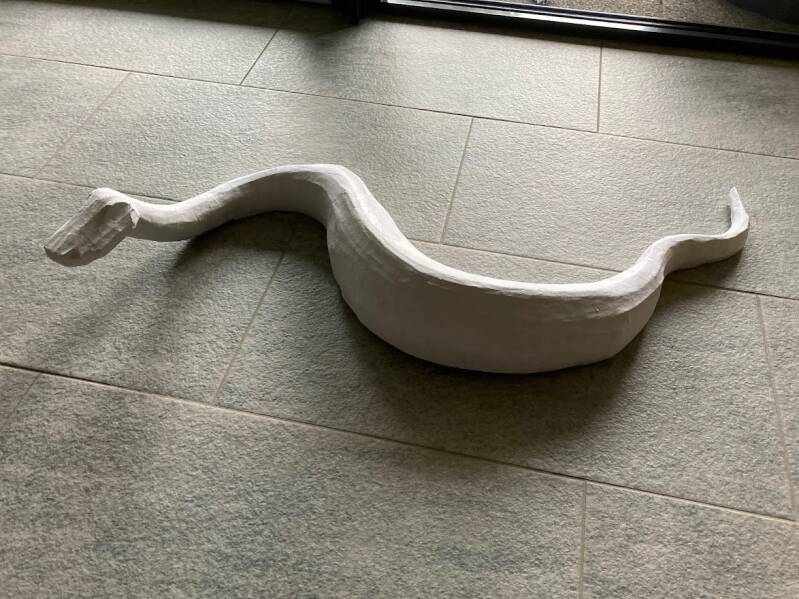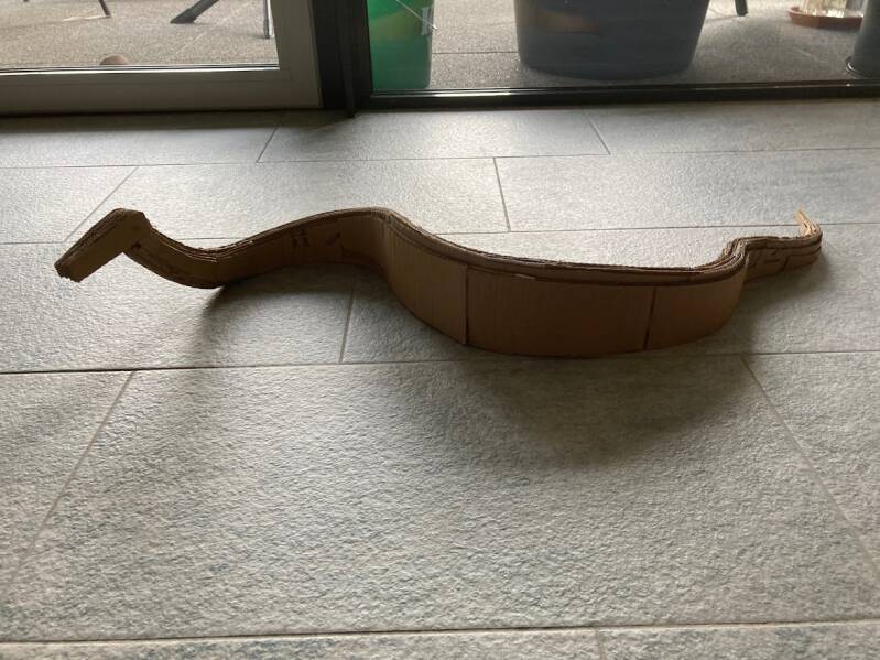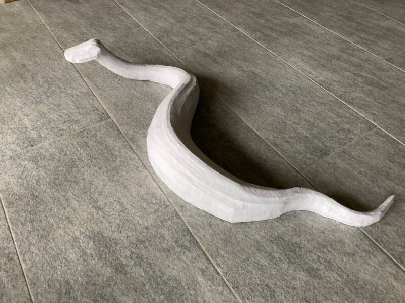 De romp van de slang bestaat uit lagen karton die ik over elkaar heb geplakt tot de dikte was bereikt die ik wenselijk achtte. Daarna ben ik met papier-maché aan de gang gegaan.