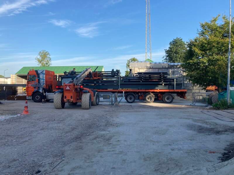 Deze ochtend reden een kraan en een vrachtwagen vol geladen met constructiemateriaal gezamenlijk de gemeentelijke werkplaats in Giessen op. Aan het einde van deze warme werkdag was de trailer van de vrachtwagen leeg en de staalconstructie geplaatst. Geweldig om te zien wat het groepje mannen in een dag tijd hebben te weten realiseren. Ze hebben samen een indrukwekkende hoeveelheid werk verzet onder een regen van zonnestralen.