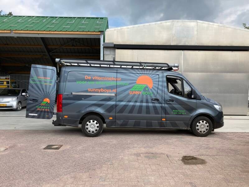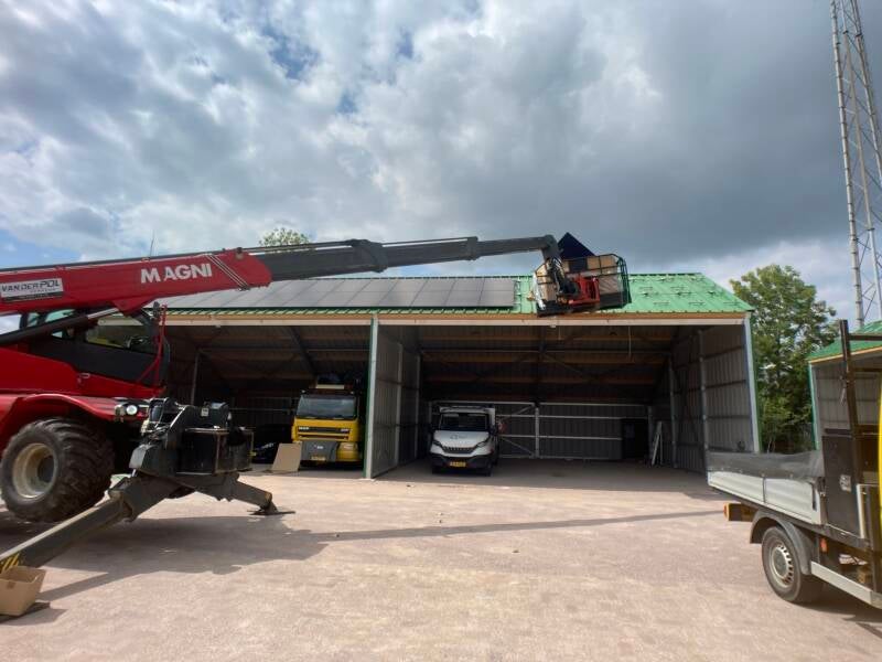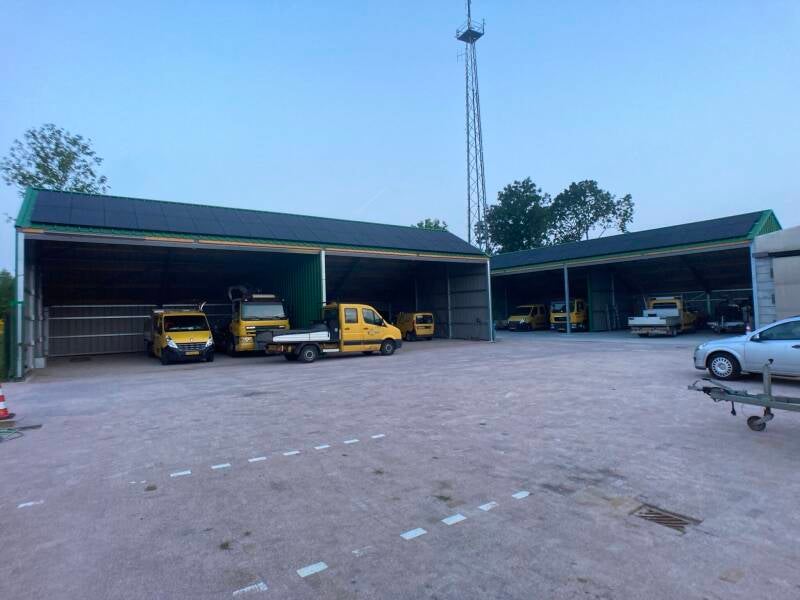 De medewerkers van Sunny Boys konden gisteren het dak op, in de letterlijke zin van het woord. En deze ochtend kon ik al het gedane werk bewonderen. Beide overkappingen van de gemeentelijke werkplaats in Giessen zijn voorzien van zonnepanelen.