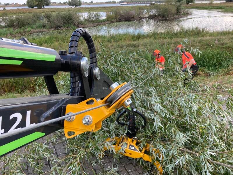 Hier zijn de mannen van ons bomenteam bezig langs een steile dijk. De lier en kraan van de snipperaar werden beide benut, tot groot gemak van onze medewerkers.