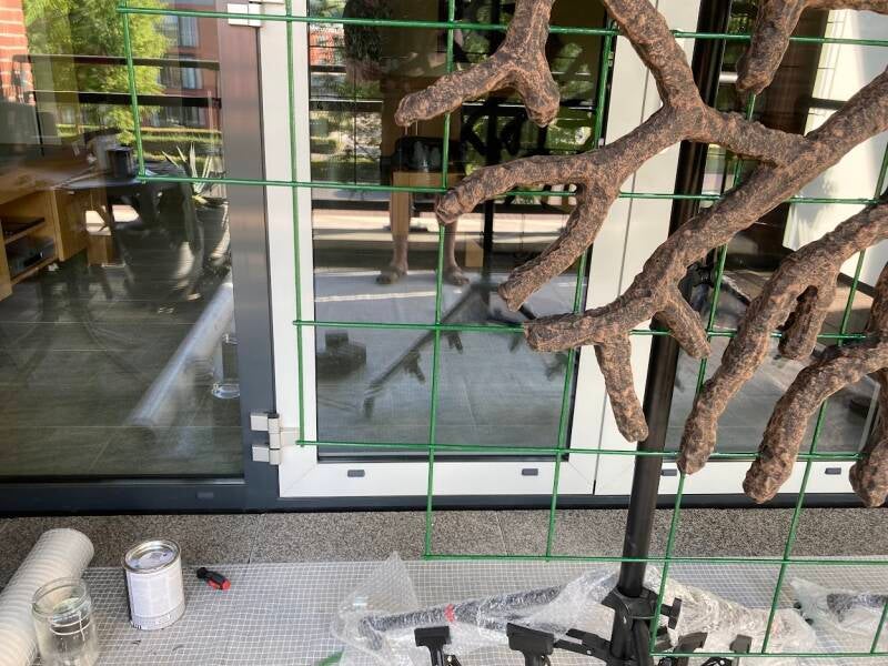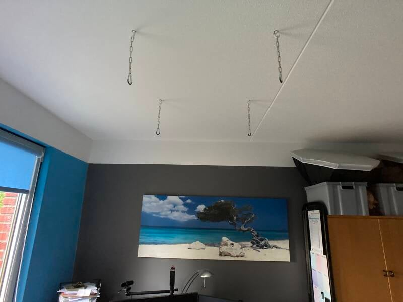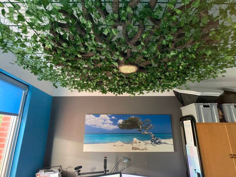 De thuiswerkplek heeft gisteren een transformatie ondergaan. Mijn vader en ik hebben een draadpaneel opgehangen, die onder normale omstandigheden voor schuttingen wordt gebruikt. Boven de twee monitors hangt een fotodoek dat me uitzicht geeft op een strand en een boom. Als ik nog verder naar boven keek zag ik een wit, gepleisterd plafond.