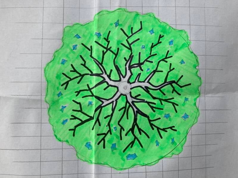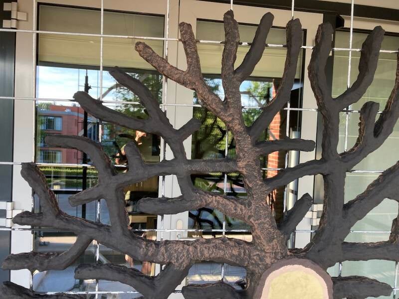 Nu kan ik naar buiten kijken en de naalden van de bladverliezende naaldbomen zien vallen, terwijl de nagebootste kroon van een boom boven mijn hoofd zijn fris ogende, groene bladeren jaarrond blijft behouden.