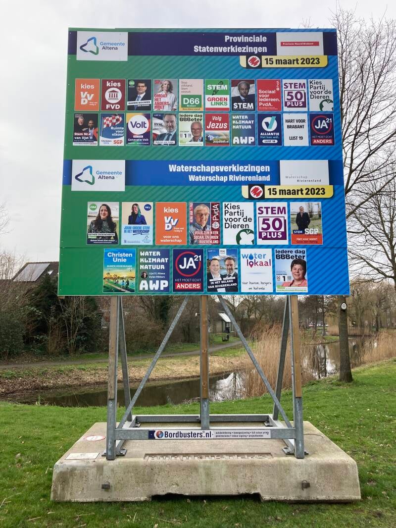Voor de komende Provinciale Staten- en Waterschapsverkiezingen van 15 maart heeft een goed op elkaar ingespeeld koppel medewerkers van Bordbusters B.V. vandaag de laatste verkiezingsborden geplaatst. Het is door heel de gemeente Altena gebeurd, waarbij de nodige kilometers zijn gemaakt. In alle vroegte waren deze mannen al aan de slag om de klus in twee dagen tijd te klaren, met als resultaat in alle 21 kernen een imposant en overzichtelijk verkiezingsbord.