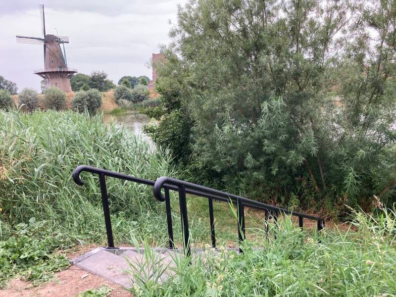 Voor de leden van de hengelsportvereniging HSV Groot Woudrichem was de afdaling naar de Loevesteingracht voor jong en oud lange tijd een gok of je met alle visspullen ongeschonden beneden kwam. Hiervoor zocht een gedreven vrijwilliger contact met de Gemeente Altena en ik nam de telefoon op. Eind april hebben we met dank aan het team Ruimtelijk Beheer hier twee trappen kunnen laten aanleggen door medewerkers van Huib van Hemert Bestrating & Grondwerk. De werkzaamheden zijn deze week met het aanbrengen van de leuningen afgerond.