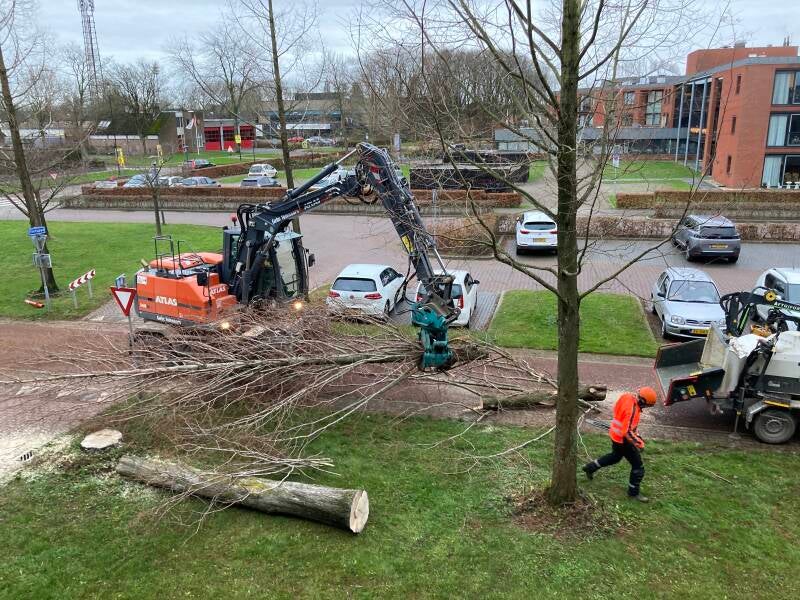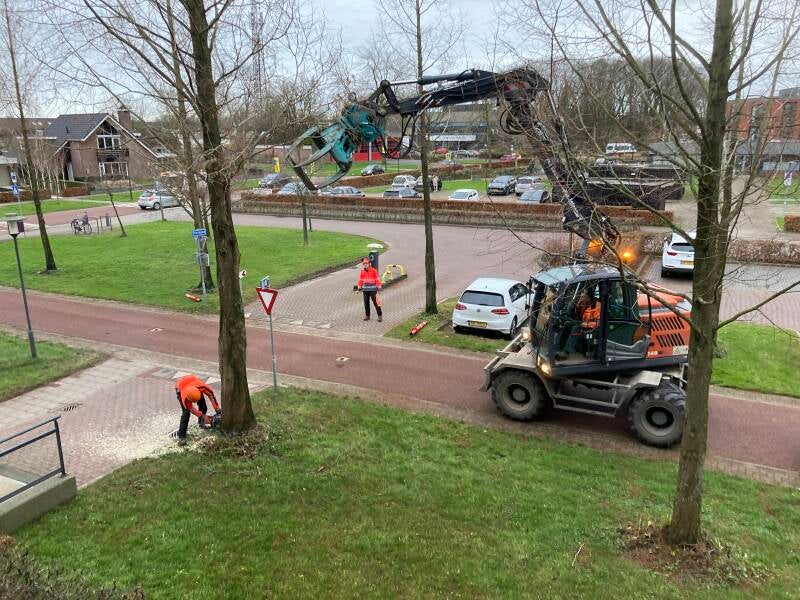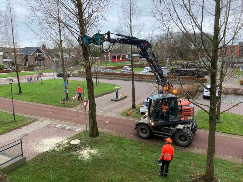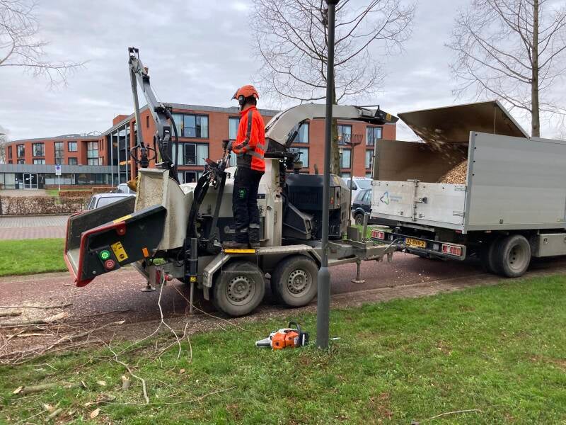 Het was de laatste klus vandaag voor het bomenteam van de Gemeente Altena. Een Metasequoia glyptostroboides (Chinese moerascypres) werd in korte tijd tot een paar stammen en een hoop houtsnippers gereduceerd, met een minimum aan overlast voor de omgeving.