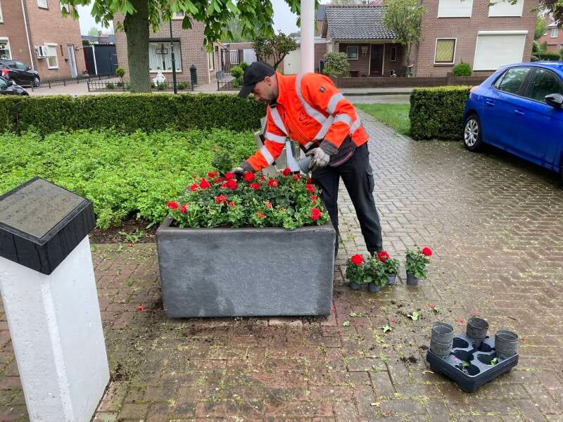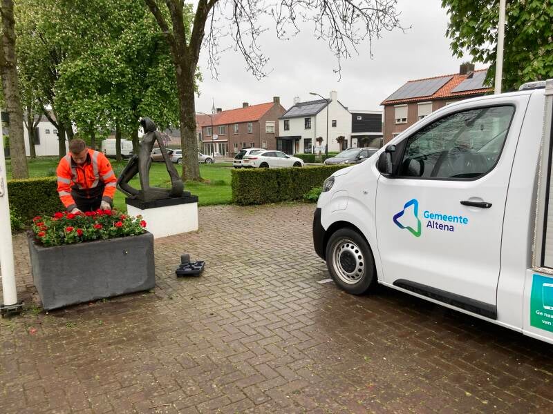 De regen heeft de medewerkers van het Team Buitendienst er deze ochtend niet van weerhouden om de bakken bij het monument weer vol planten te zetten. Allemaal voorbereidingen voor de komende Dodenherdenking en Bevrijdingsdag op 4 en 5 mei. De Gemeente Altena en tientallen vrijwilligers zijn hier de komende tijd mee bezig.