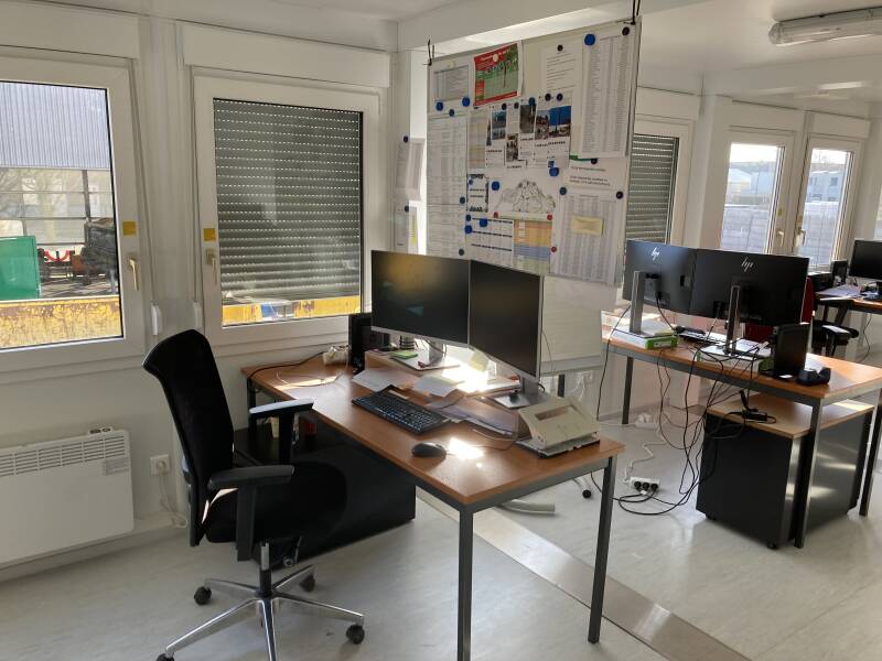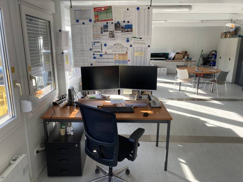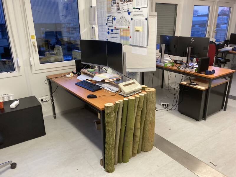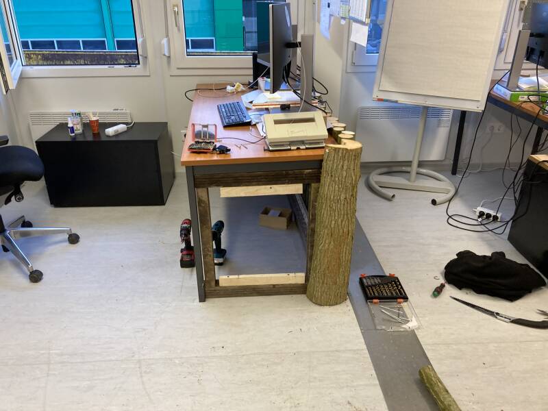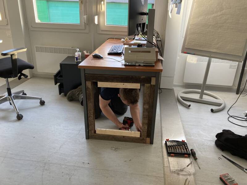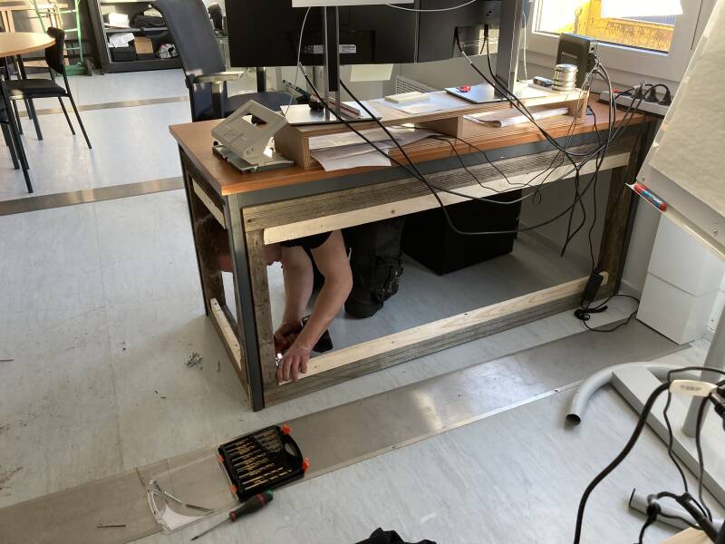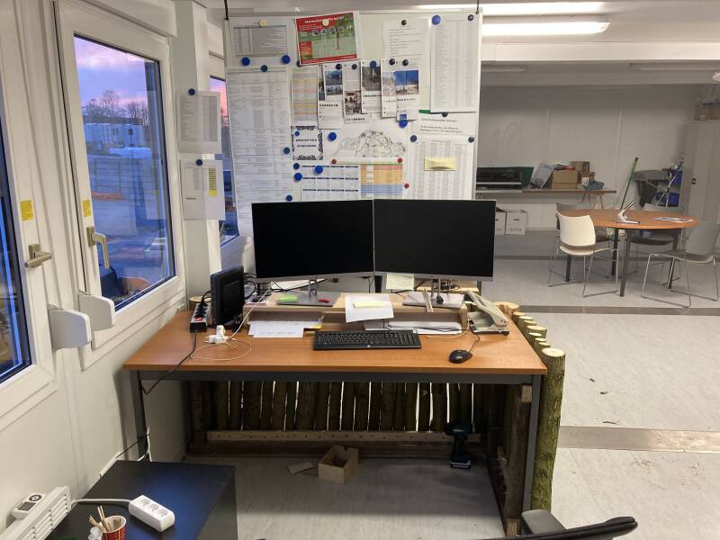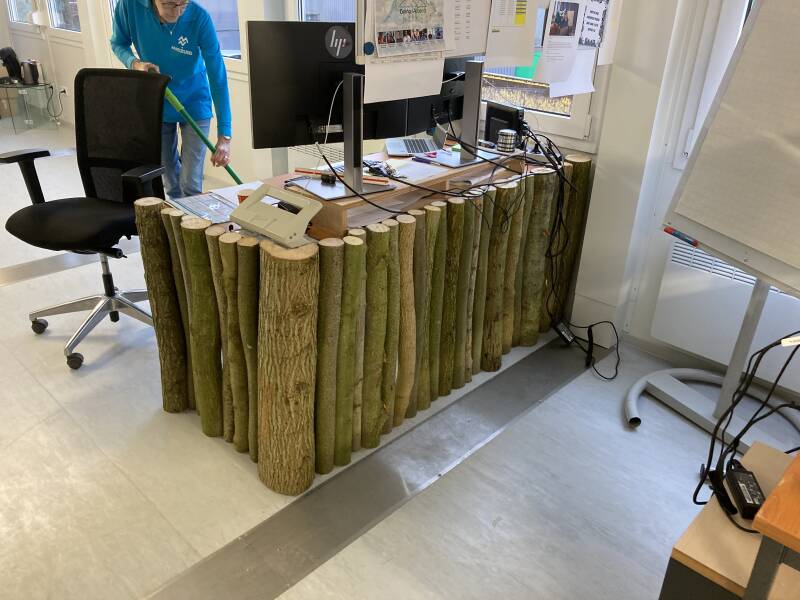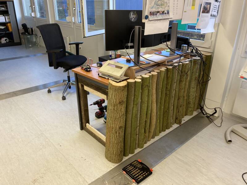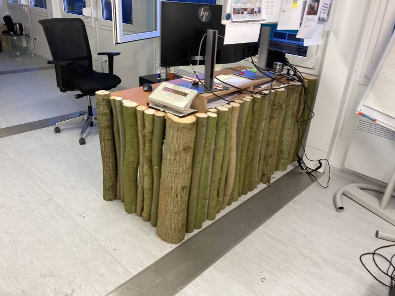 Tijdelijk gehuisvest in units tot de verbouwing van de gemeentewerf is afgerond heb ik van de gelegenheid gebruik gemaakt om de tafel waaraan ik meestal zit te werken wat meer aan te 'kleden'. Als het straks allemaal nieuw is kan zoiets niet meer, maar nu liggen er kansen en ik was niet van plan deze aan me voorbij te laten gaan. Een collega wilde me hier graag bij behulpzaam zijn en samen hebben we wat gemaakt van afvalhout.